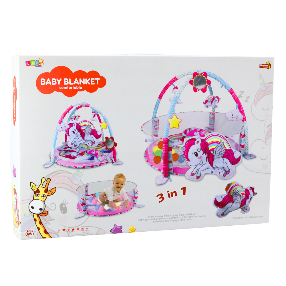 Edukacyjna mata 3w1 z jednorożcem to wielofunkcyjna przestrzeń do zabawy i odpoczynku, stworzona z myślą o najmłodszych dzieciach. Ta urocza, kolorowa mata z motywem jednorożca łączy w sobie aż trzy funkcje: klasyczną matę edukacyjną z pałąkami i zawieszkami, suchy basen z piłeczkami oraz miękką przestrzeń do turlania się i nauki samodzielnego siadania.