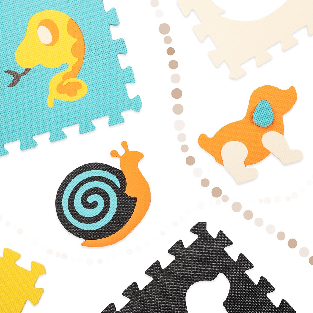 Wyjmowane elementy puzzli sprawdzą się doskonale w nauce rozpoznawania kształtów, a ich żywe kolory przyciągną uwagę dziecka. Mata jest łatwa w czyszczeniu – wystarczy przetrzeć ją wilgotną ściereczką. Jest też wodoodporna, co ułatwia codzienne użytkowanie.