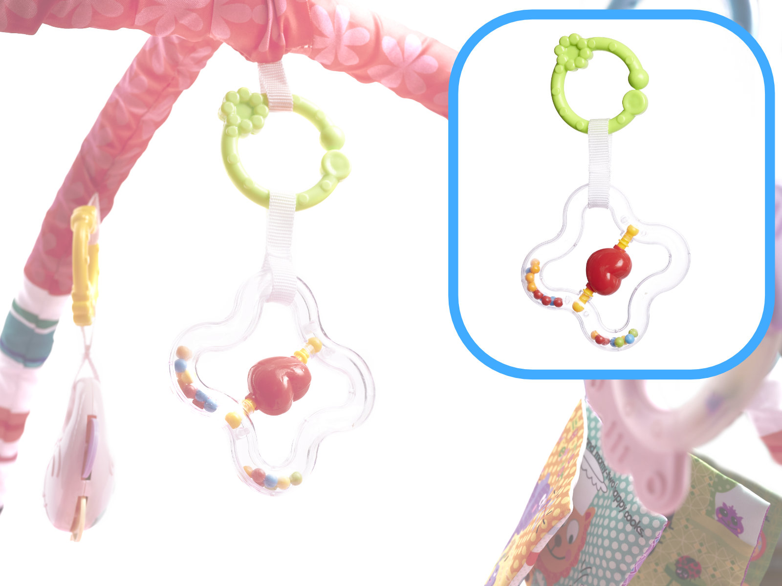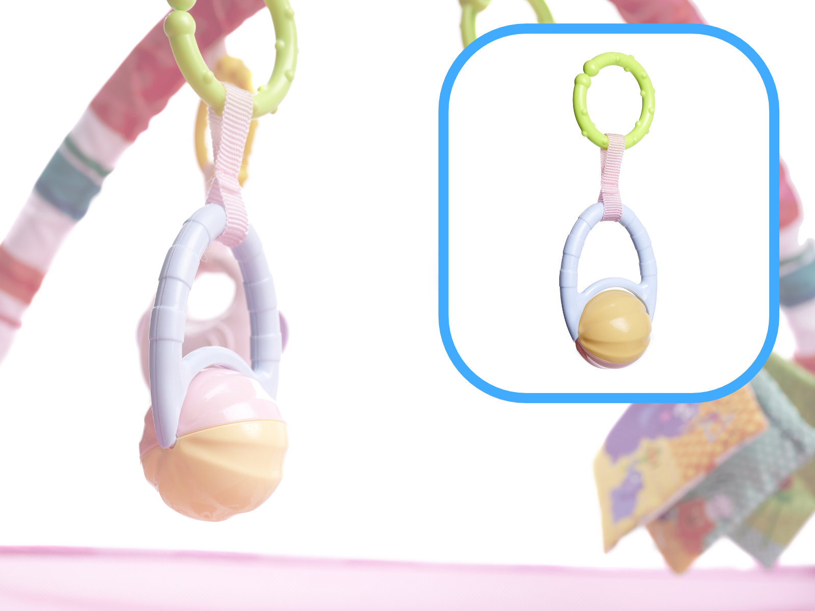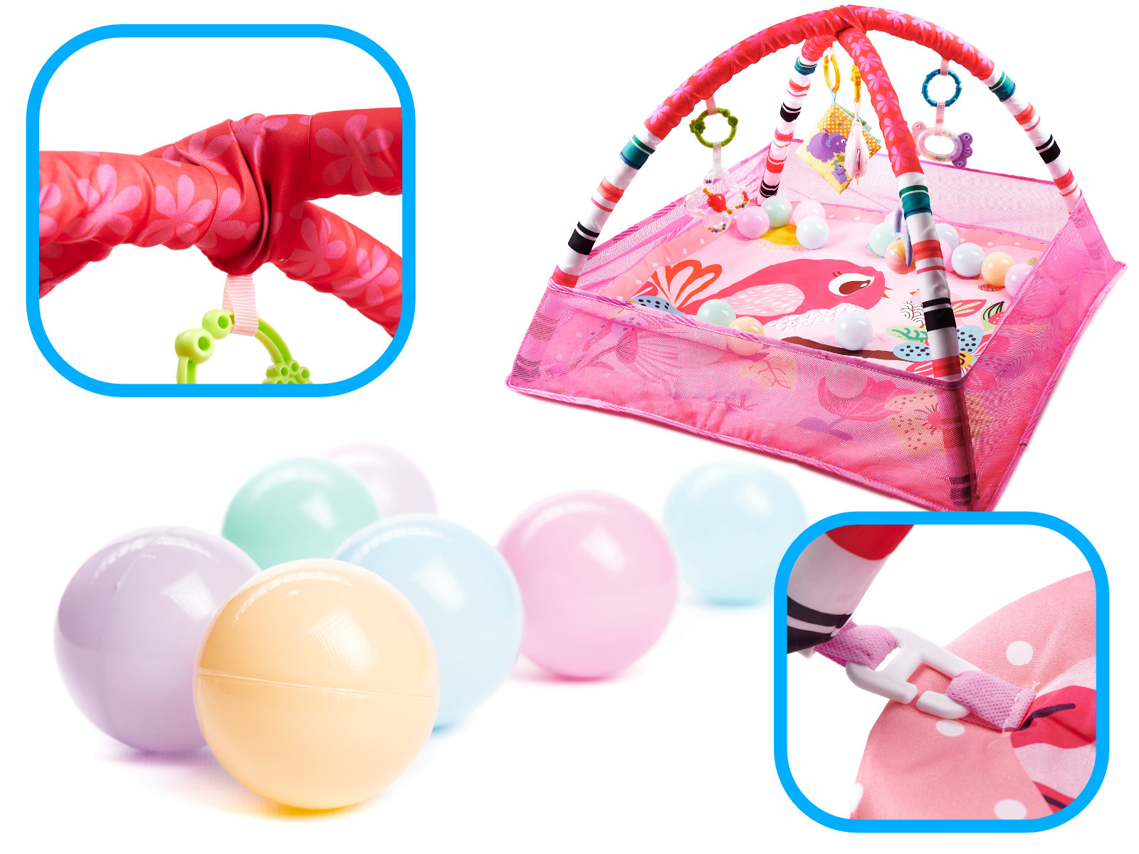 Mata z zabawkami zawieszonymi na pałąkach- kolorowe zabawki zawieszone na pałąku będą przyciągały uwagę maluszka i motywowały do ćwiczenia i wzmacniania mięśni karku, rąk i nóg. Dodatkowo świetnie sprawdzi się podczas pierwszych prób samodzielnego siadania.