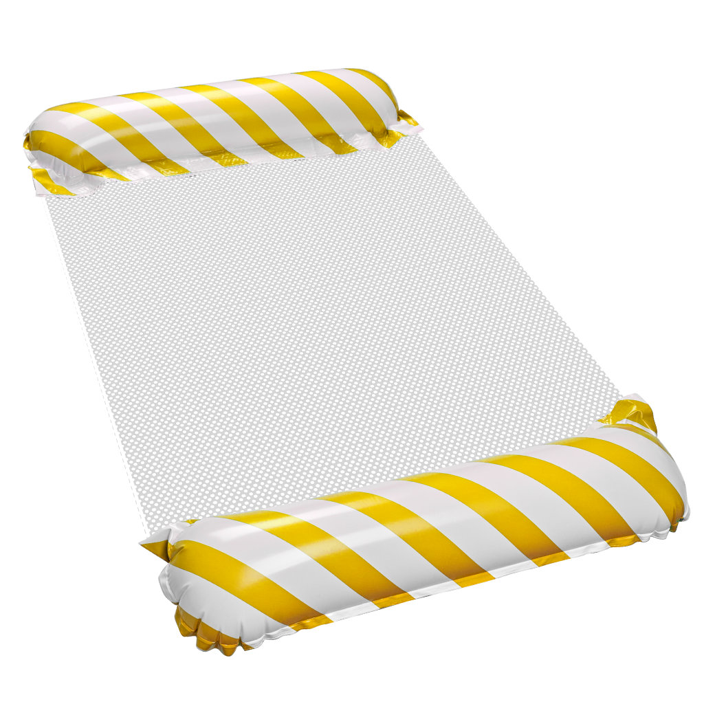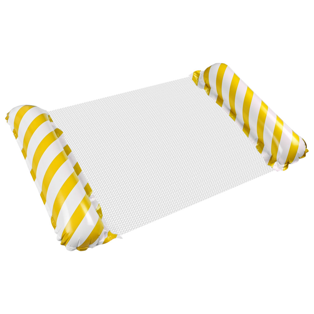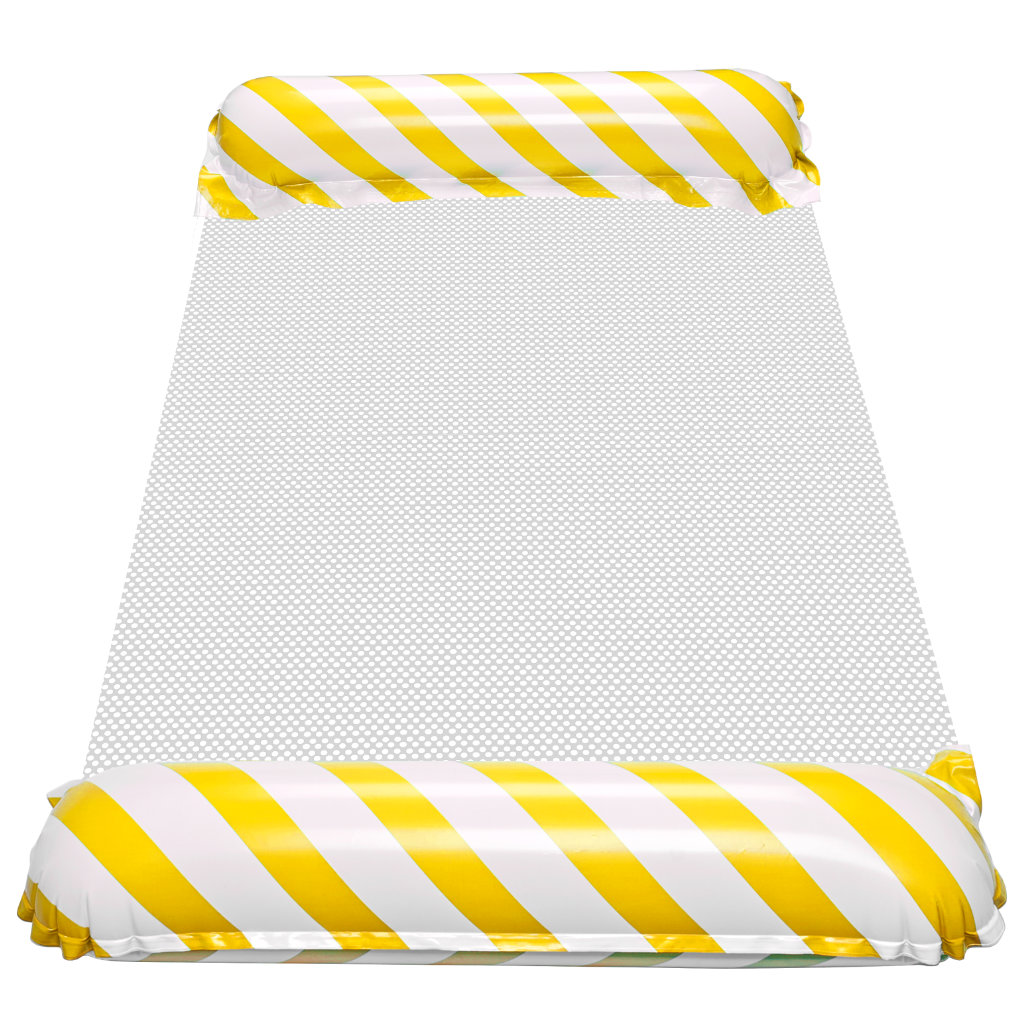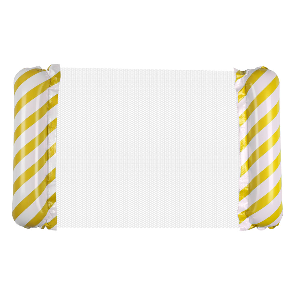 Żółty dmuchany materac plażowy to idealny wybór na letnie dni. Dzięki stabilnym oparciom, wzmocnionym materiałową siatką, możesz swobodnie unosić się na wodzie. Jego biało-żółte paski wprowadzają beztroski klimat wakacji, który umili każdą chwilę spędzoną nad wodą.