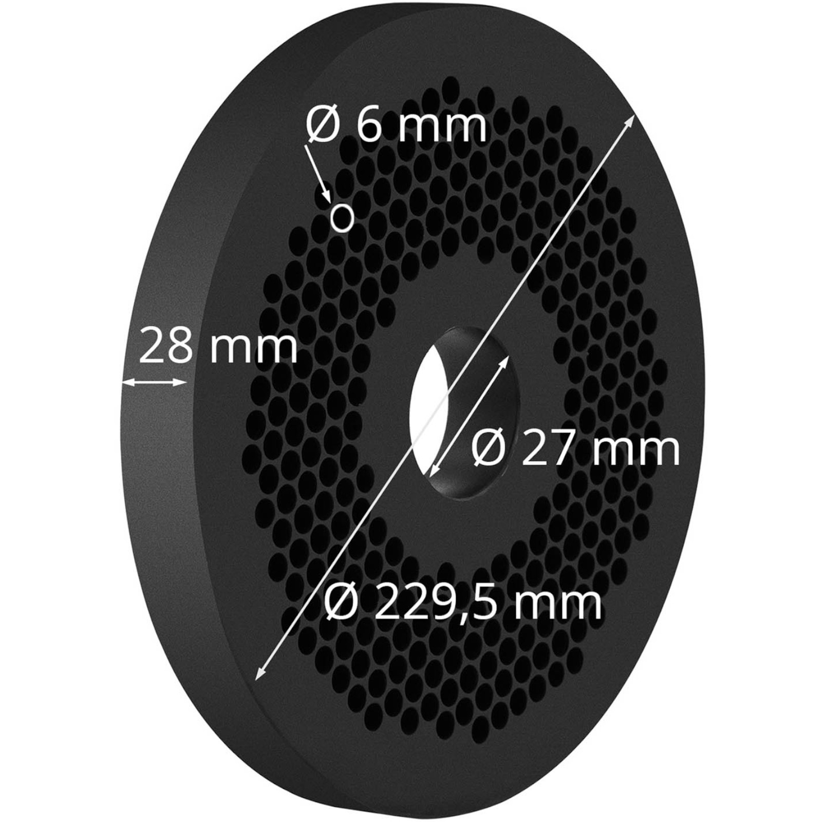 Oferowana matryca wytwarza granulki o średnicy 6 mm, co czyni ją idealnym wyborem dla efektywnej produkcji. Jej średnica wynosi 229,5 mm, a wysokość 28 mm, co pozwala na precyzyjne umiejscowienie pod rolką dociskową.