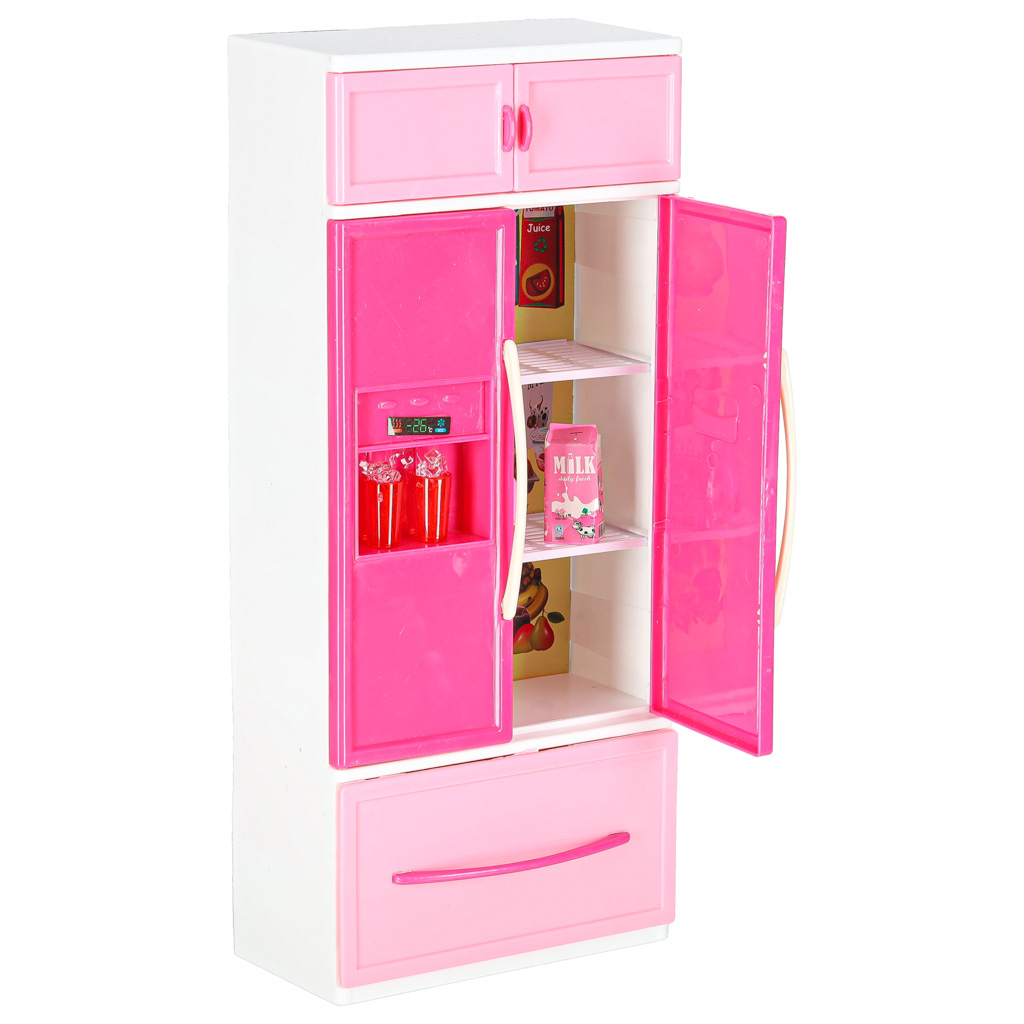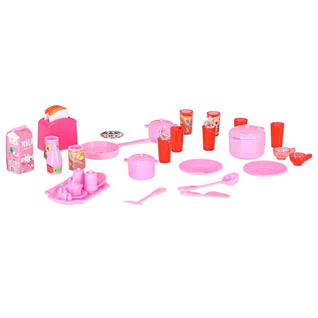 W zestawie znajdują się również akcesoria, takie jak karton mleka, 3 plastikowe szklanki, filiżanka do kawy, toster z ruchomą rączką, patelnia, dwa garnki z przykrywkami, plastikowe łopatki, chochla, zestaw do kawy oraz kostki lodu.