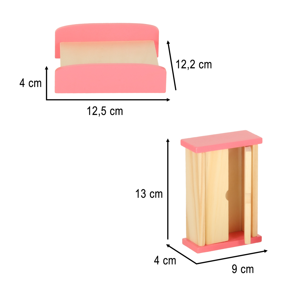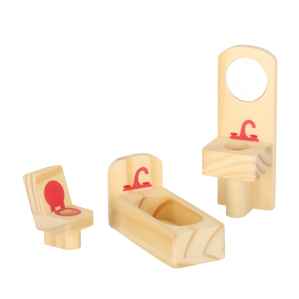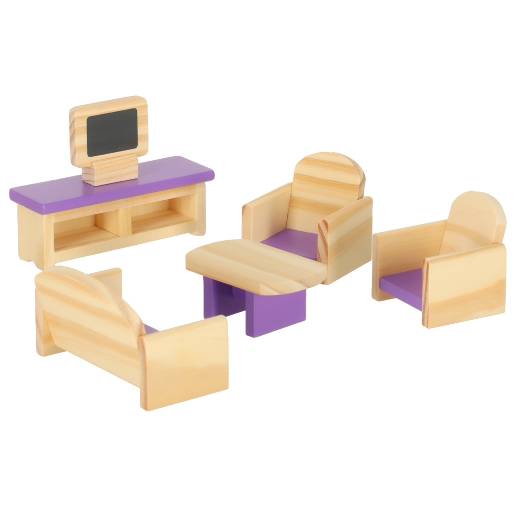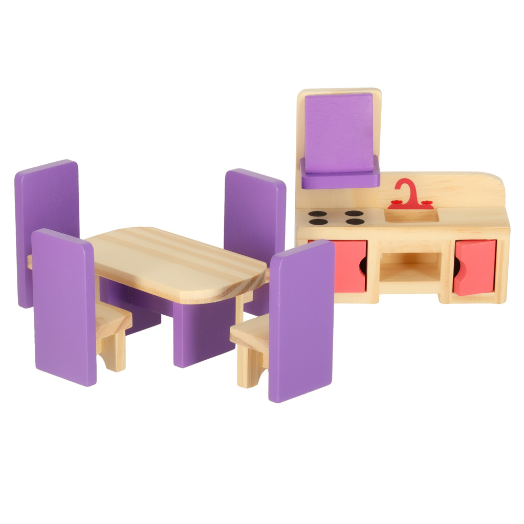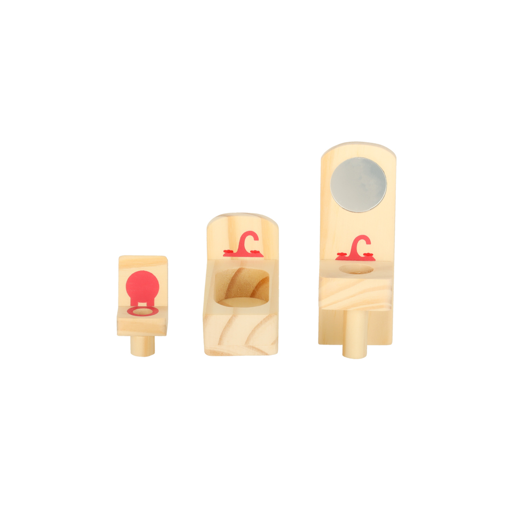 Zestaw drewnianych mebelków do domku dla lalek, który rozwija wyobraźnię i kreatywność. Dzięki nim dziecko może tworzyć różnorodne scenki, co sprzyja rozwojowi zdolności opowiadania historii.