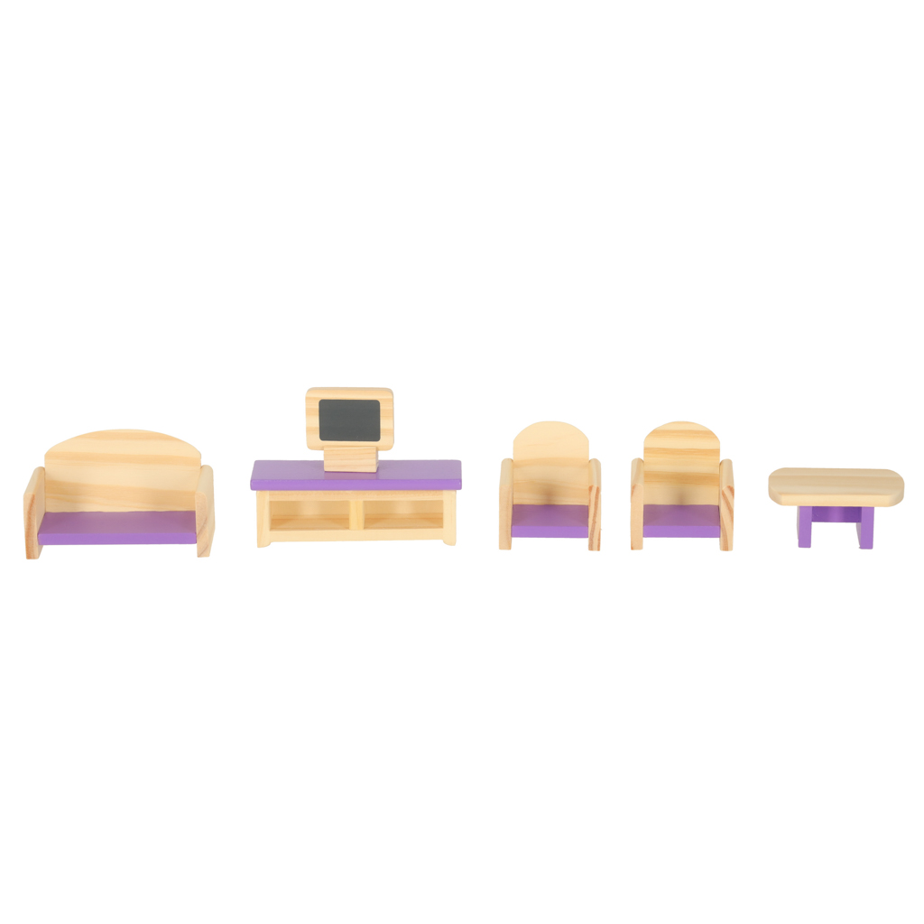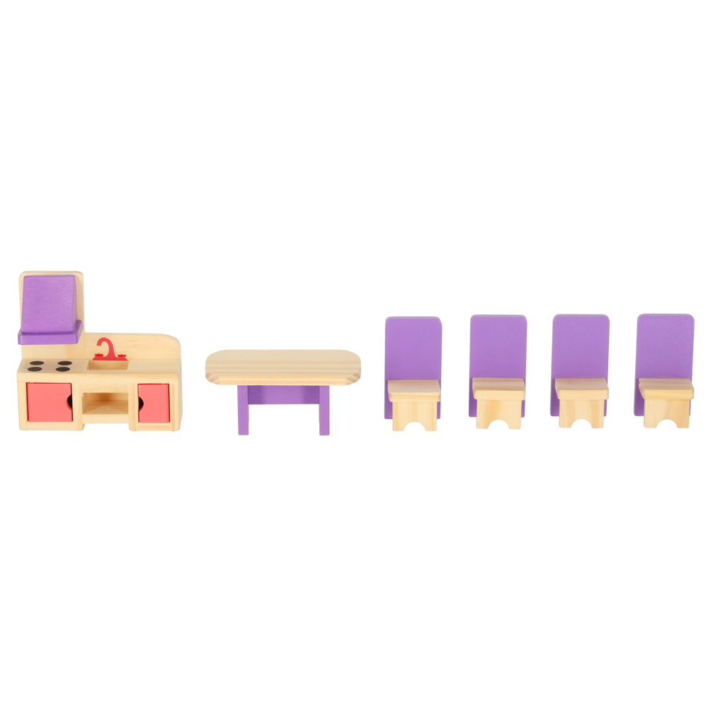 Każdy element wykonany jest z solidnego drewna, gładko oszlifowanego, co zapewnia trwałość na wiele lat. Mebelki pomalowane są bezpiecznymi farbami w odcieniach fioletu i różu, co nadaje domkowi unikalny styl.