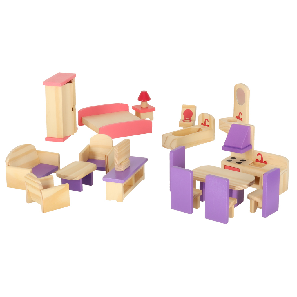 Drewniane mebelki to idealny dodatek, który pozwoli dziecku urządzić domek według własnego pomysłu. Zestaw składa się z 19 elementów, które uczynią wnętrza bardziej stylowymi i funkcjonalnymi.