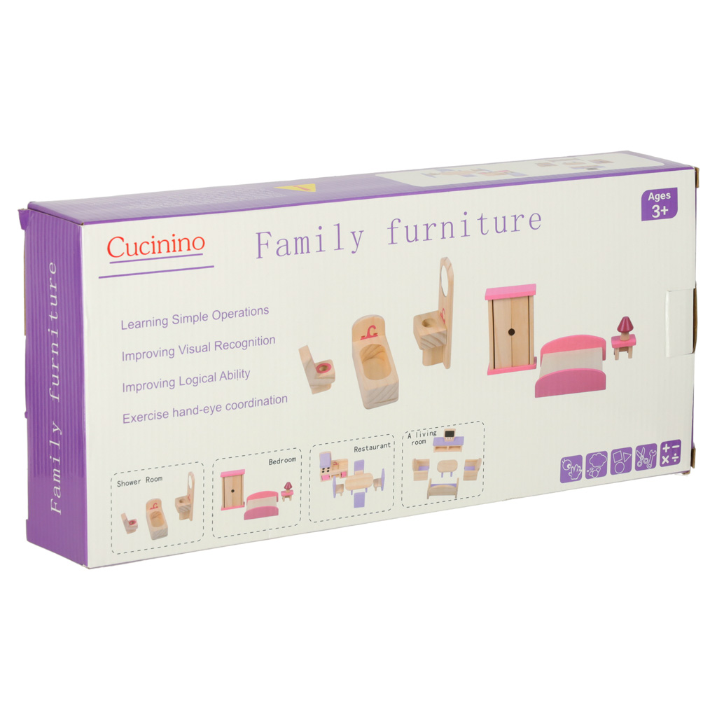 Zestaw obejmuje meble do salonu, sypialni, łazienki i kuchni, co umożliwia odwzorowanie realistycznych scenek z życia. Elementy takie jak łóżko, wanna, stolik, szafa, kuchnia czy krzesła pozwalają na tworzenie interesujących historii z życia lalek.