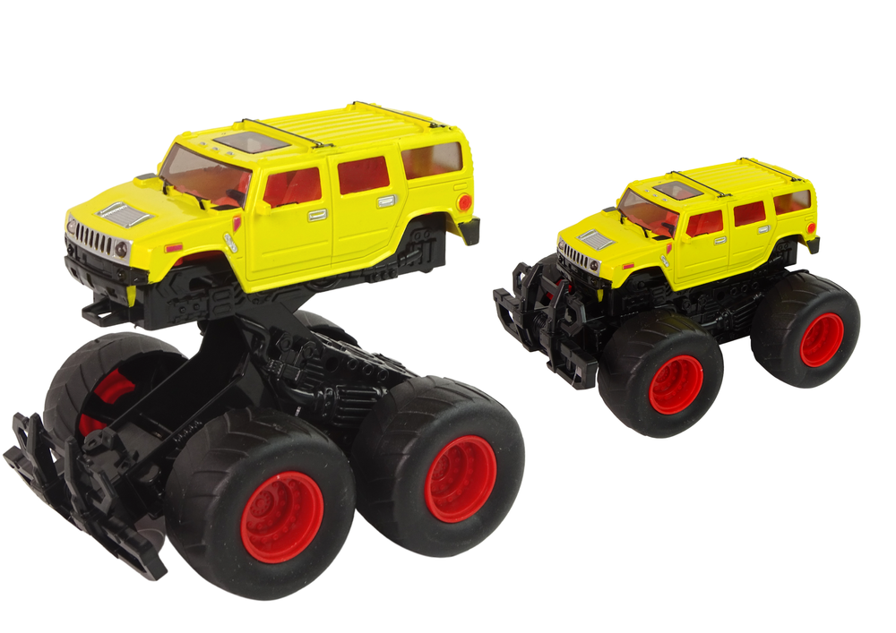 Autko wykonane jest z metalu z dodatkiem plastiku. Posiada plastikowe duże opony i wysokie zawieszenie. Naciskając na dół, puszczasz autko do przodu, gdy tylko napotka przeszkodę odskakuje i automatycznie się podwyższa. Niesamowita frajda dla malucha!