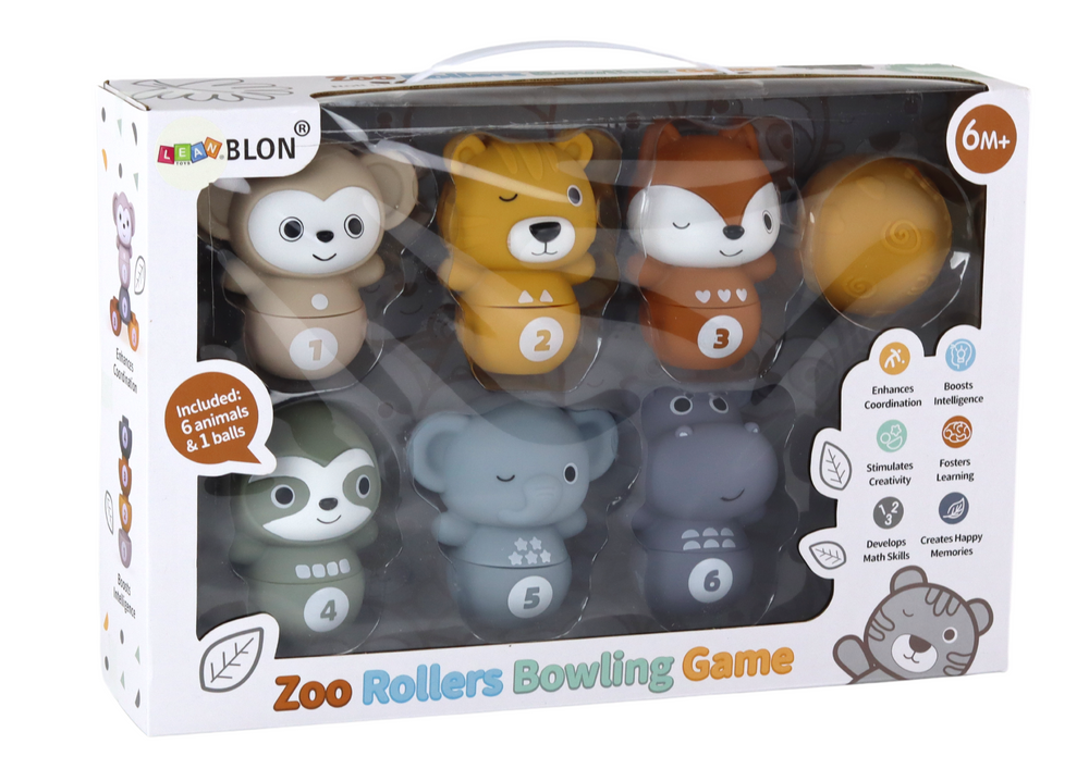 Każdy z 6 kręgli przedstawia inne zwierzątko i posiada numerację, co pomaga w nauce liczenia i rozpoznawaniu cyfr. Dodatkowo, kręgle można rozłożyć na dwie części, ukazując różne kształty do dopasowania, co stymuluje rozwój poznawczy dziecka.