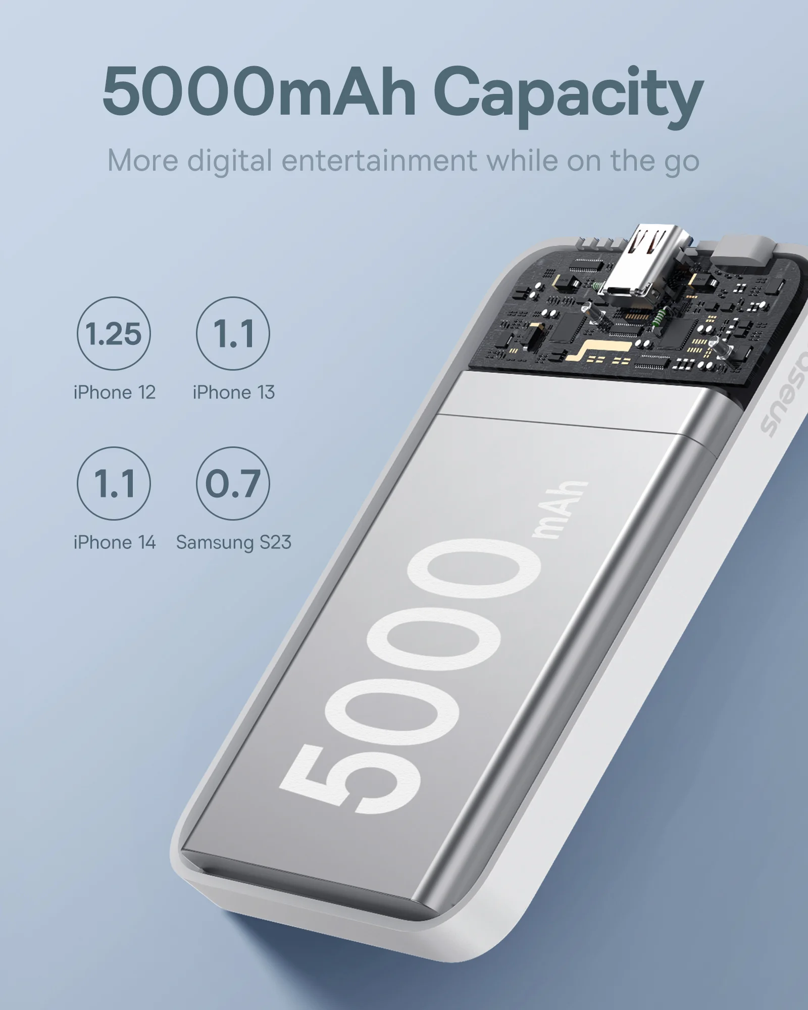 Powerbank o pojemności 5000mAh waży zaledwie 138g, co sprawia, że jest niezwykle lekki i poręczny. Z łatwością zmieści się w kieszeni czy torebce, co czyni go idealnym towarzyszem w podróży.