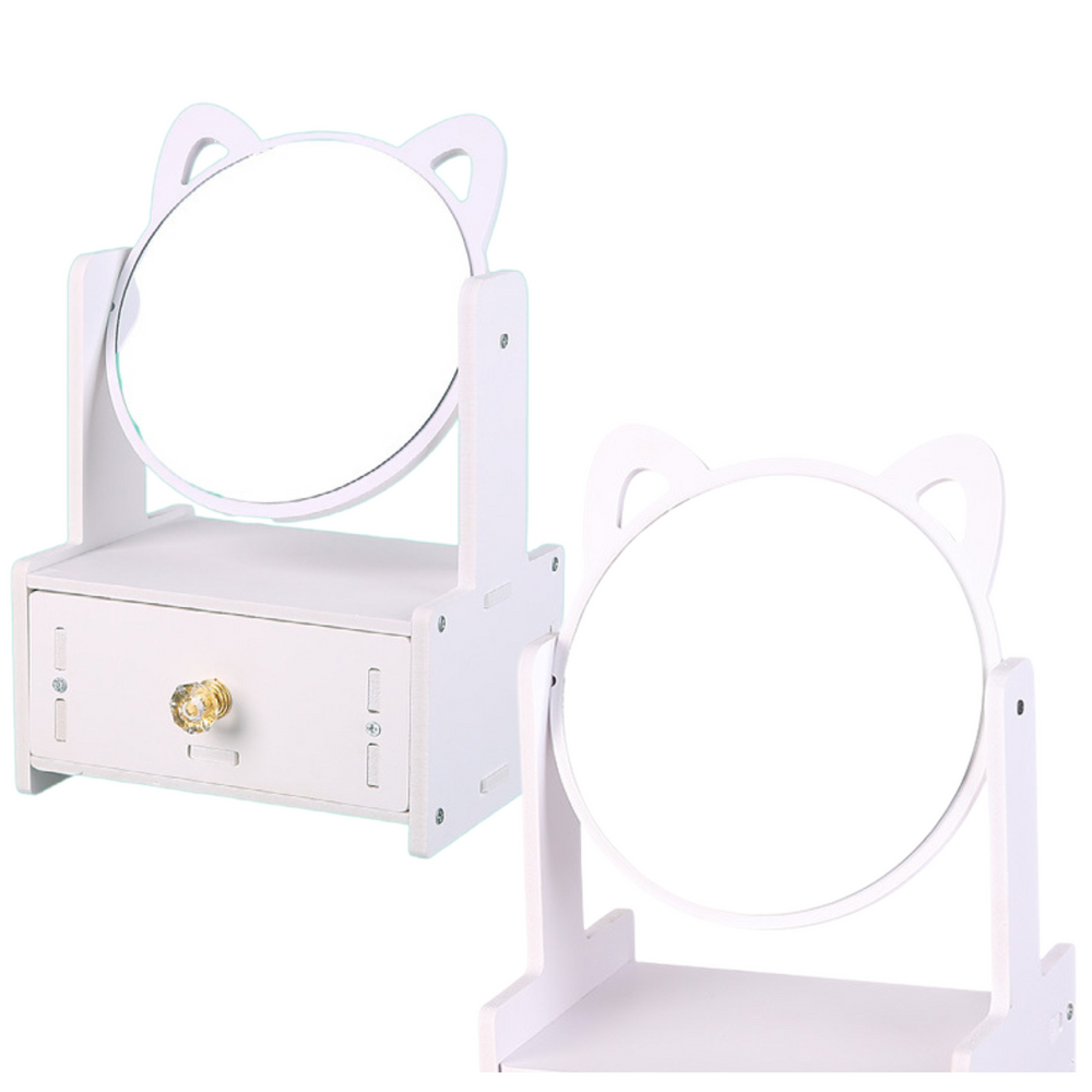 Dodatkowym atutem jest wbudowana szuflada, która zapewnia praktyczne miejsce na przechowywanie kosmetyków, biżuterii czy innych drobnych akcesoriów, pomagając w organizacji przestrzeni. Stylowe, ozdobne uszy dodają całości elegancji i sprawiają, że lusterko wyróżnia się spośród klasycznych modeli.