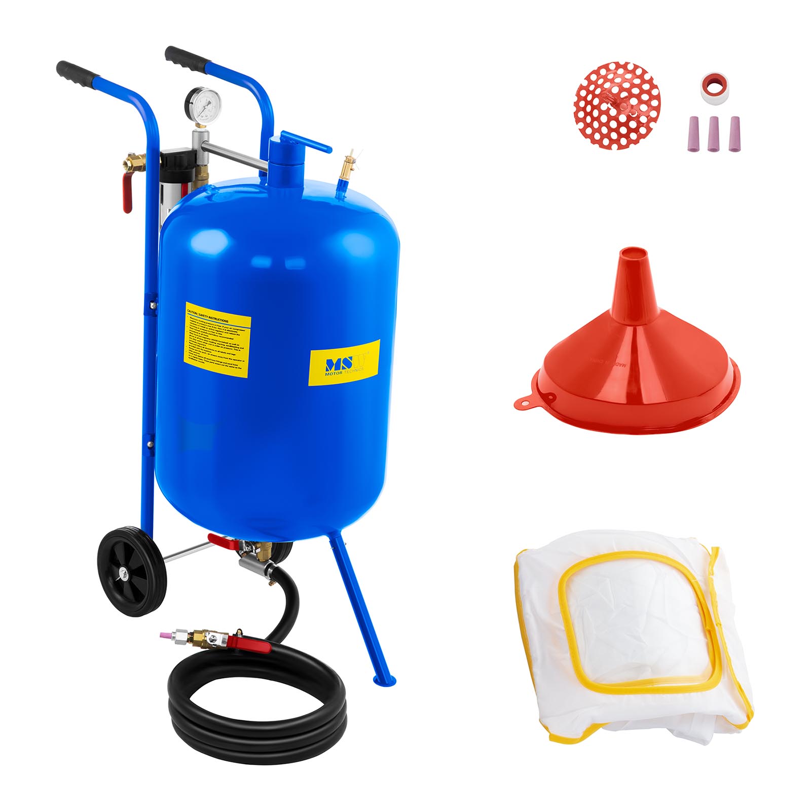 Mobilna piaskarka syfonowa MSW to idealne narzędzie do skutecznego oczyszczania metalowych powierzchni z rdzy oraz usuwania lakieru i farby z drewna. Dzięki dużej pojemności zbiornika wynoszącej 76 l, urządzenie zapewnia długotrwałą pracę bez konieczności częstego uzupełniania materiału. Maksymalne ciśnienie robocze 9 bar oraz wbudowany syfon gwarantują wysoką wydajność piaskowania.