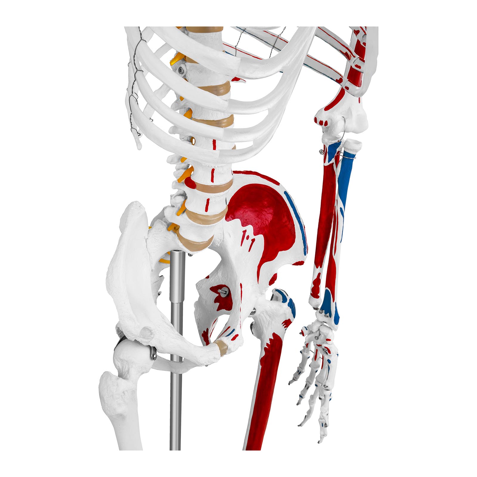 Odkryj dokładne odwzorowanie ludzkiego układu kostnego w postaci modelu szkieletu o wysokości 180 cm. Dzięki zastosowaniu ruchomych kończyn i łączeń, możesz zobaczyć, jak funkcjonują stawy. Model został pomalowany w sposób, który podkreśla łączenie mięśni z kośćmi – mięśnie w kolorze czerwonym, a łączenia w niebieskim. Dodatkowo, czaszka jest otwierana, co umożliwia szczegółowe zapoznanie się z anatomią.
