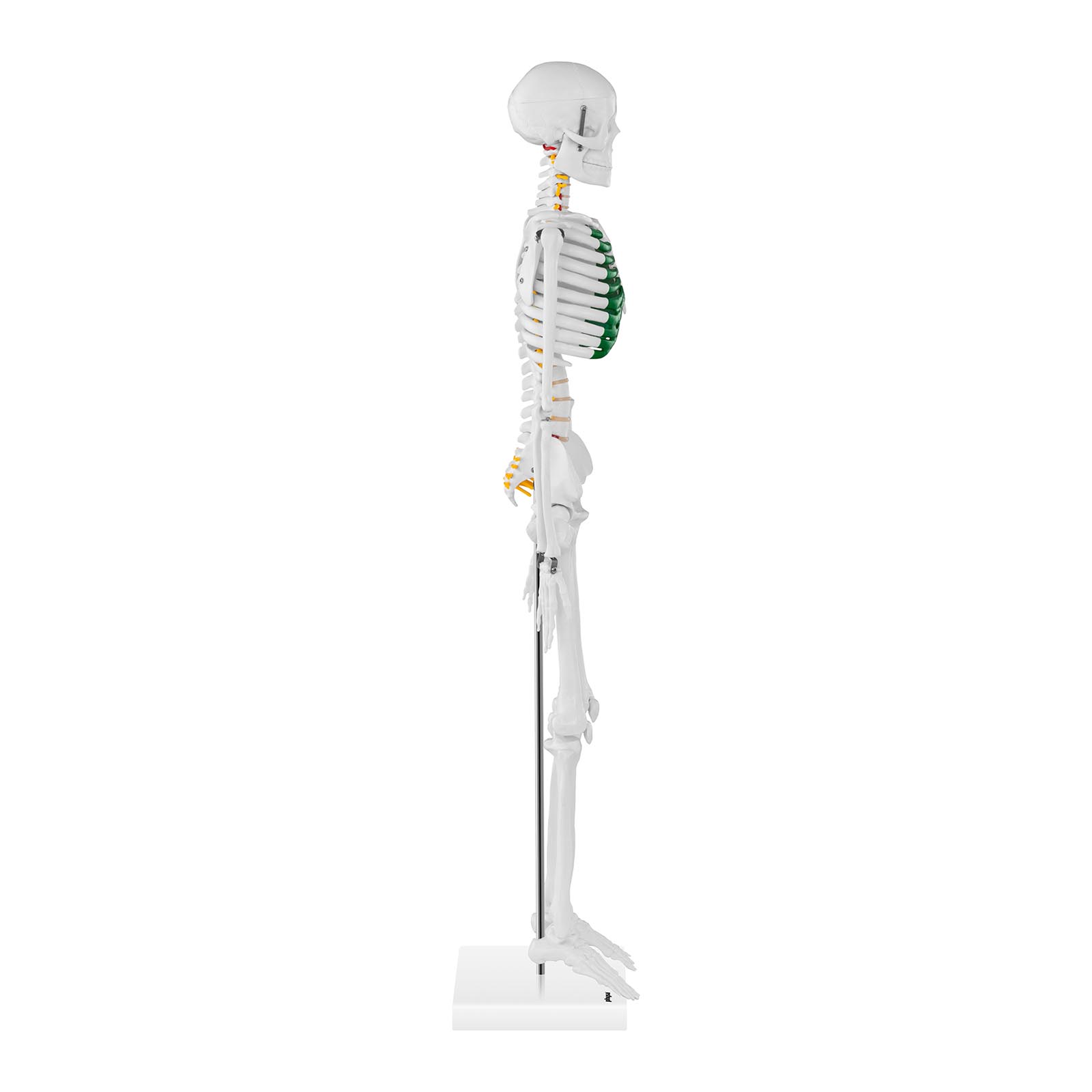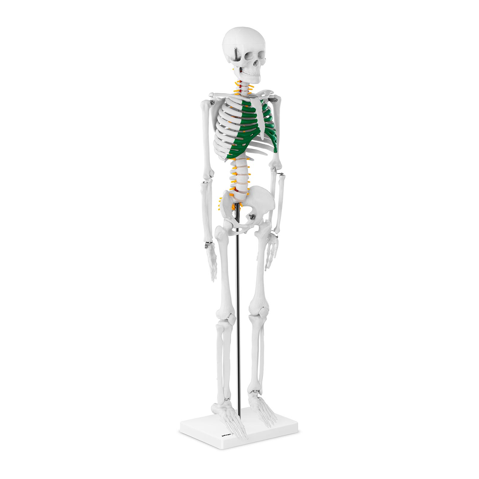 W skład modelu wchodzą: szczegółowo odwzorowany kręgosłup, naczynia kręgowe, korzenie nerwów oraz krążki międzykręgowe, co zapewnia dokładność w nauce. Dodatkowo, chrząstki na żebrach zostały pofarbowane na zielono, co podkreśla budowę klatki piersiowej. Czaszka modelu składa się z trzech części, co również wpływa na jego elastyczność.