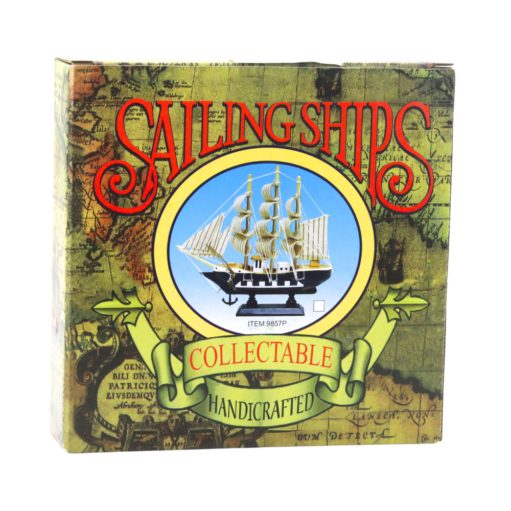 Ten urokliwy model trójmasztowego żaglowca to klasyczna miniatura stylizowana na jednostki pływające z czasów żeglugowych szlaków handlowych. Biały kadłub z czarnym pasem oraz intensywnie niebieskie wnętrze wyróżniają się na tle innych modeli, tworząc lekki, dekoracyjny akcent w stylu nadmorskich portów. Charakterystyczne tekstylne żagle w granatowe paski oraz staranne olinowanie podkreślają jego ekspozycyjny charakter i przywołują skojarzenia z morską bryzą i otwartym oceanem.