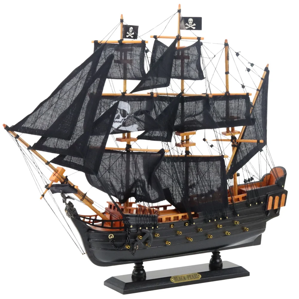 Imponujący model pirackiego galeonu to wierna replika klasycznego żaglowca z epoki złotego wieku piractwa. Trójmasztowa konstrukcja, rozbudowane olinowanie, charakterystyczne czarne żagle i flagi z motywem czaszki i piszczeli nadają modelowi niepowtarzalnego, mrocznego charakteru. Statek wzorowany na legendarnych okrętach korsarskich, takich jak „Queen Anne’s Revenge” czy „Black Pearl”, idealnie oddaje ducha morskich podbojów i nieokiełznanej wolności.
