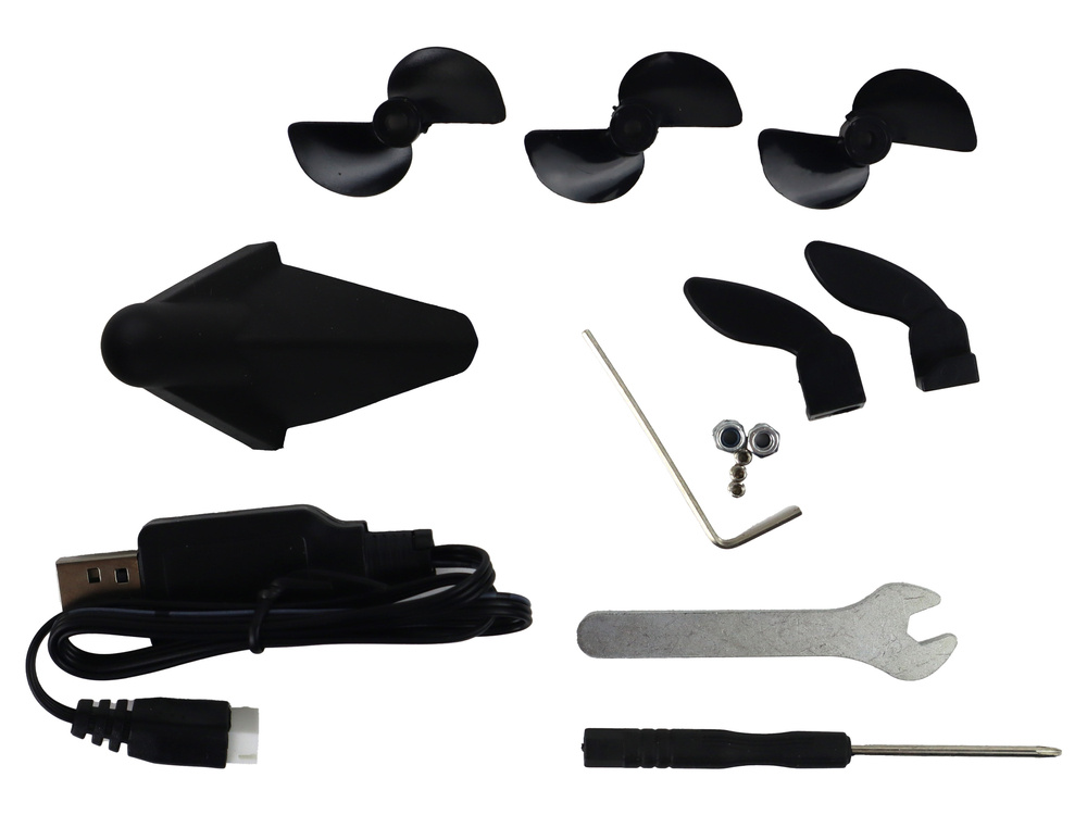 Zestaw zawiera także dodatki takie jak: kabel do akumulatora, podstawkę pod motorówkę, która zapewni jej stabilność na lądzie, dwa wymienne śmigła oraz dwa wymienne stery.