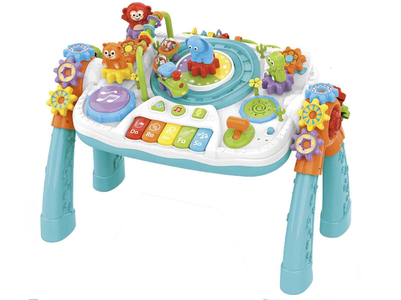 Stolik zawiera muzyczne przyciski oraz pianinko, które może odtwarzać pojedyncze dźwięki lub po zmianie trybu odgłosy instrumentów.
