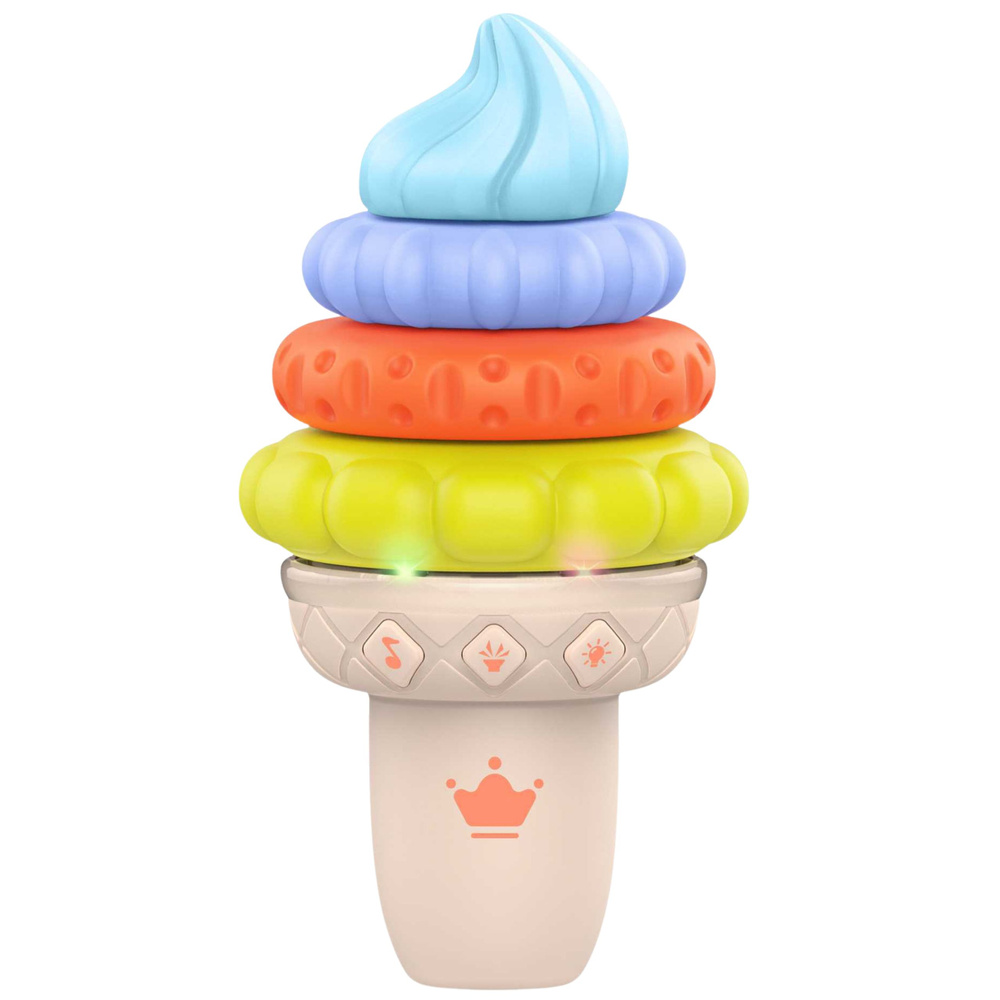 Po naciśnięciu przycisków na podstawie dziecko może usłyszeć melodie, aktywować światła lub inne efekty dźwiękowe, które urozmaicają zabawę i dostarczają dodatkowych bodźców. Elementy można układać w dowolnej kolejności, co wspiera rozwój logicznego myślenia oraz ćwiczy sprawność manualną. Zabawka została wykonana z bezpiecznych, trwałych materiałów dostosowanych do małych rączek.