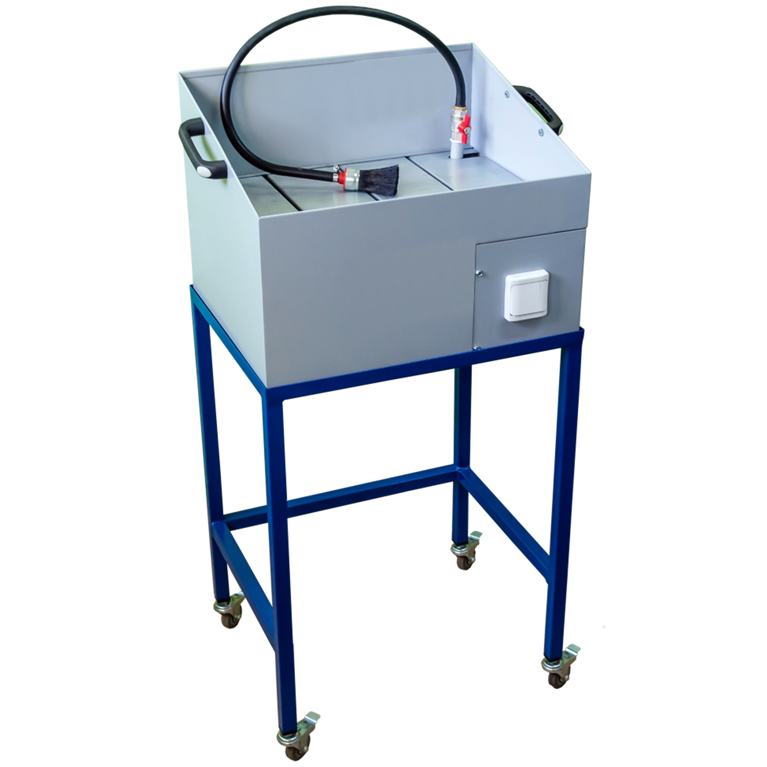 Myjka działa na zasadzie pompy elektrycznej, która podaje płyn myjący przez pędzel przelotowy. Płyn, przepływając przez pędzel, rozpuszcza zanieczyszczenia, a cięższe osady opadają na dno. Dzięki temu, czysty płyn wraca do obiegu, co zwiększa efektywność mycia.