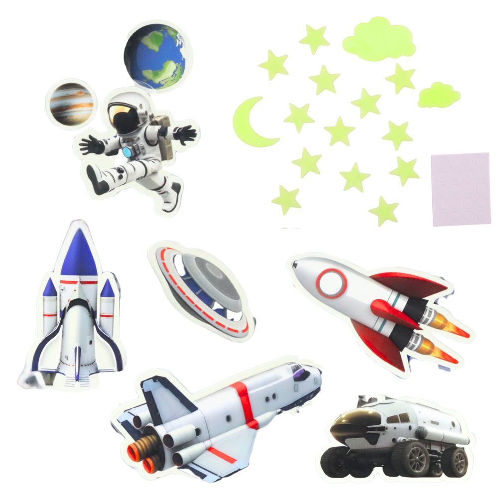 Zestaw fluorescencyjnych naklejek na ścianę z motywem kosmicznym to niezwykła dekoracja, która pozwoli stworzyć w pokoju dziecięcym atmosferę pełną przygód i odkrywania wszechświata. W komplecie znajdują się rakiety, planety, astronauci oraz inne elementy kosmiczne, które świecą w ciemności, tworząc magiczny efekt wizualny. Całość uzupełniają gwiazdki, księżyc i chmurki fluorescencyjne, które zamieniają wnętrze w bajkową przestrzeń.