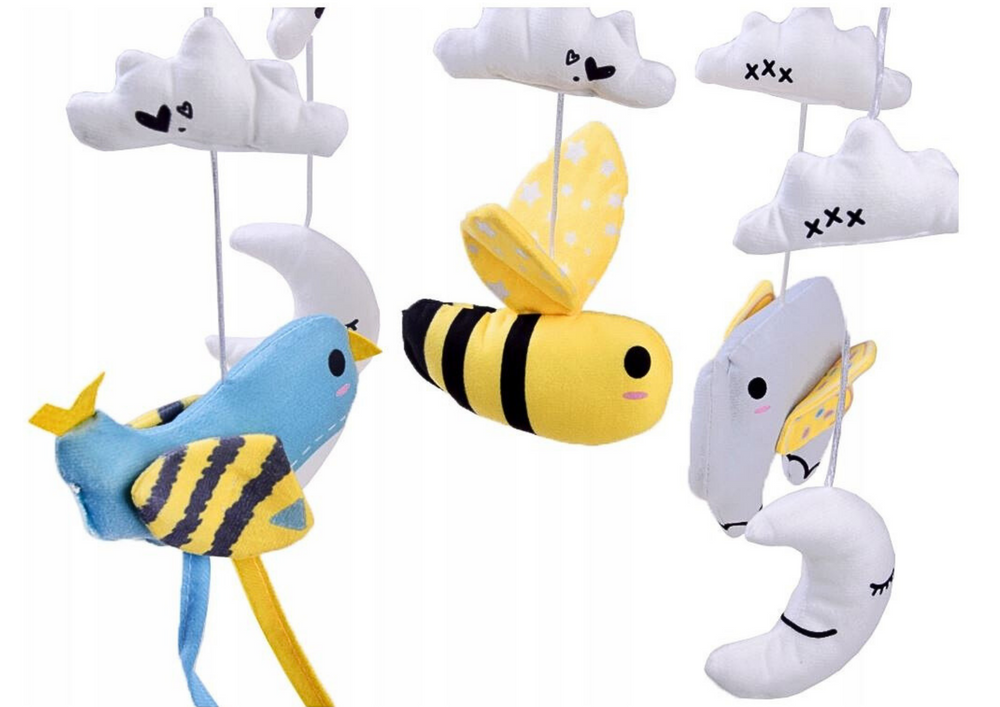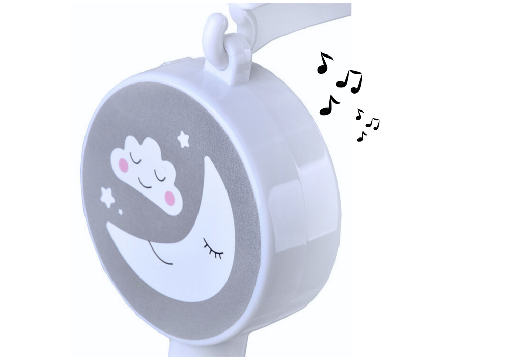 Karuzelka do łóżeczka z pluszowymi chmurkami to idealna zabawka dla maluszka. Motywem karuzelki są wesołe chmurki, księżyc i kolorowe zwierzątka na pewno spodobają się bobaskowi, a delikatny ruch i spokojna melodia kołysanki będą działały uspakajająco i ułatwią zasypianie.