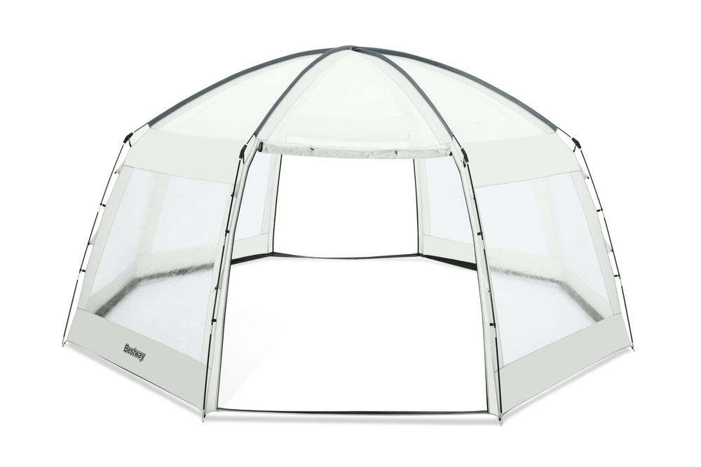 Rozkładany namiot to idealne rozwiązanie na upalne dni. Kompatybilna ze wszystkimi nadmuchiwanymi spa i basenami o średnicy do 4,88 m, zapewnia prywatność i chroni przed deszczem, słońcem i innymi czynnikami pogodowymi. Altana jest podobna do namiotu Namiot może być używany przez cały rok. Montaż jest szybki i łatwy - zajmuje tylko 15 minut. 295 cm wysokości umożliwia swobodne poruszanie się oraz komfortowe wejście do basenu nawet przy pomocy drabinki.Stwórz swoją własną oazę na swoim podwórku dzięki okrągłej kopule basenowej. Ta kopuła jest podobna do namiotu i ma unikalną dwuwarstwową konstrukcję, która zapewnia czystość basenu i ochronę przed słońcem.