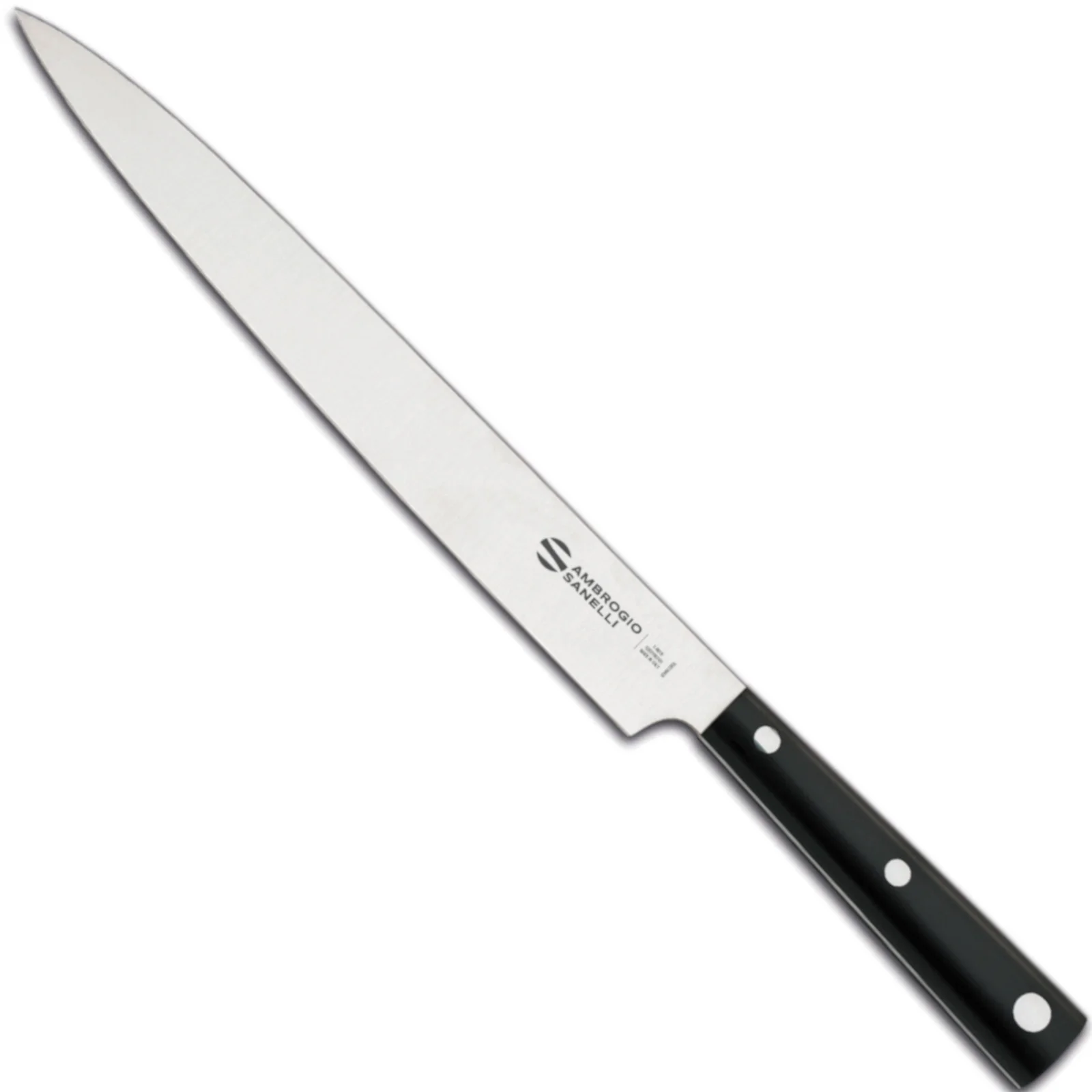 Nóż Yanagi Sashimi od Ambrogio Sanelli to doskonałe narzędzie do przygotowywania sushi oraz sashimi. Dzięki zastosowaniu japońskiej techniki ostrzenia jednostronnego, minimalizuje tarcie, co pozwala na precyzyjne krojenie. Ostrze, wykonane z modyfikowanej stali nierdzewnej NITRO-B, charakteryzuje się twardością na poziomie 57-58 HRC oraz wysoką odpornością na korozję.