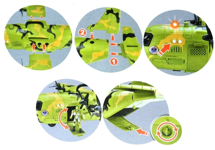 Zestaw z serii militarnej został wykonany z atestowanego, solidnego materiału, jakim jest plastik. Kolorystyka samolotu urozmaicona wzorami moro doskonale nawiązuje do wojskowych barw, co sprawia, że zabawka wygląda bardzo realnie. Samolot odznacza się bardzo dużym rozmiarem — rozpiętość jego skrzydeł to aż 64 cm, natomiast długość - 55 cm. W konstrukcji samolotu uwzględnione ruchome i otwierane elementy. Śmigła znajdujące się na skrzydłach samolotu, są obrotowe, tak samo, jak potrójna broń wystająca z okien maszyny. Drzwi znajdujące się w przedniej i tylnej części statku powietrznego otwierają się, co pozwala na umieszczenie figurek w środku zabawki. W bocznej części samolotu umieszczone są dwa guziczki, których wciśnięcie uruchamia efekty świetlne i dźwiękowe, czyniące zabawę jeszcze lepszą frajdą!