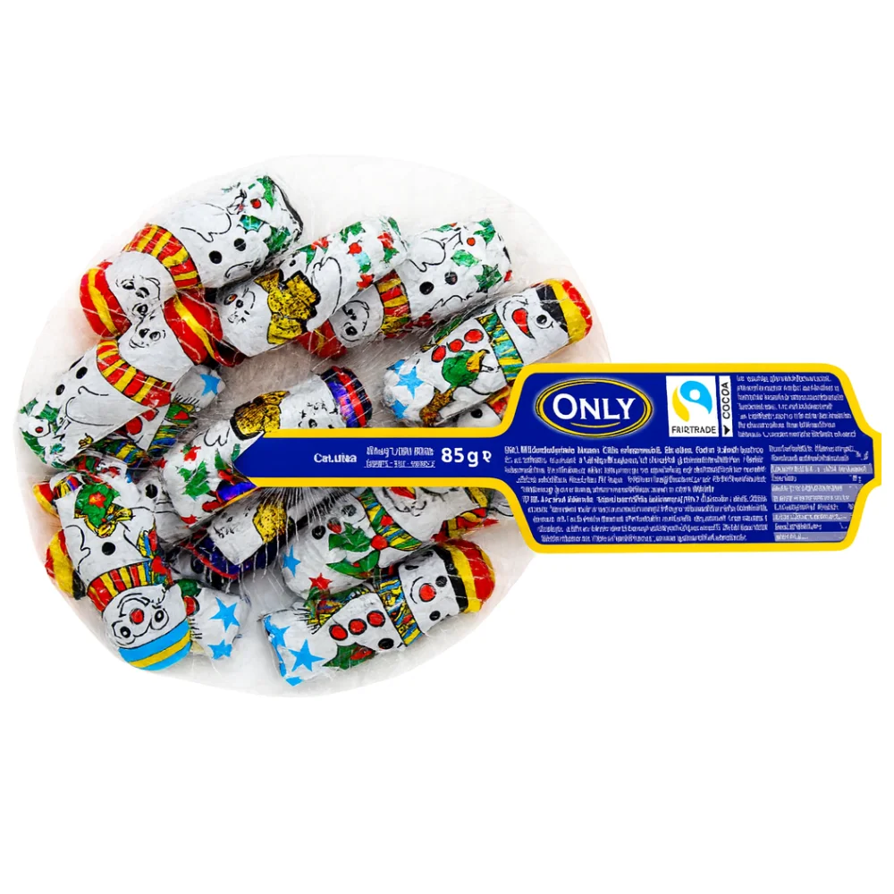Bałwanki Czekoladowe są zapakowane w urokliwą siatkową torbę, co czyni je doskonałym prezentem dla bliskich. Masa netto wynosi 85 g, a w opakowaniu znajduje się około 12-14 sztuk.