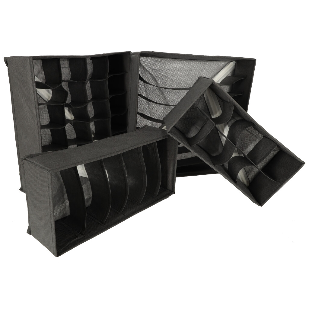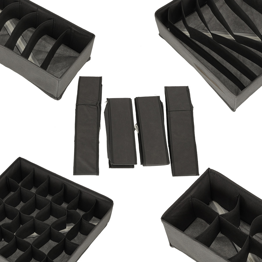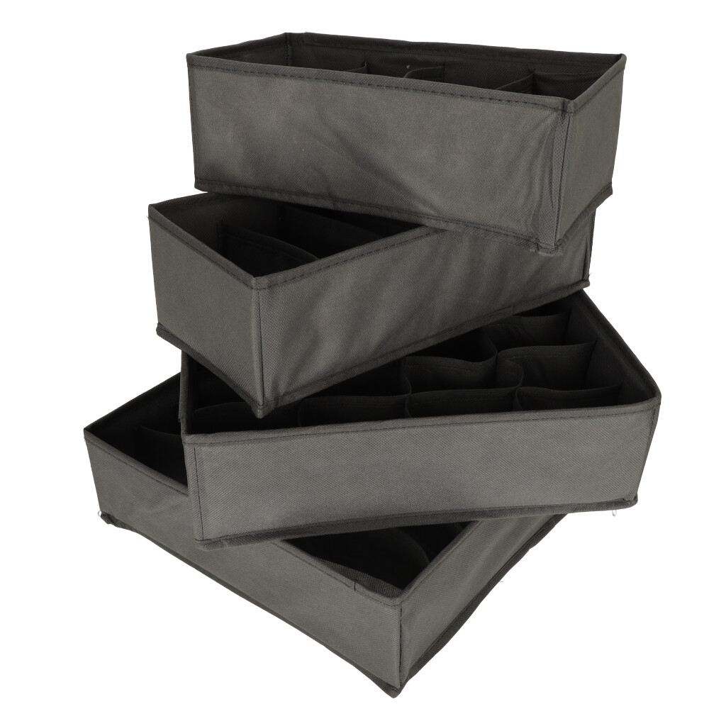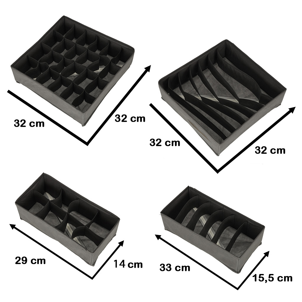 W zestawie znajdują się cztery pojemniki o różnych rozmiarach, które idealnie nadają się do segregacji skarpetek, bielizny i innych akcesoriów. Organizer pomieści: