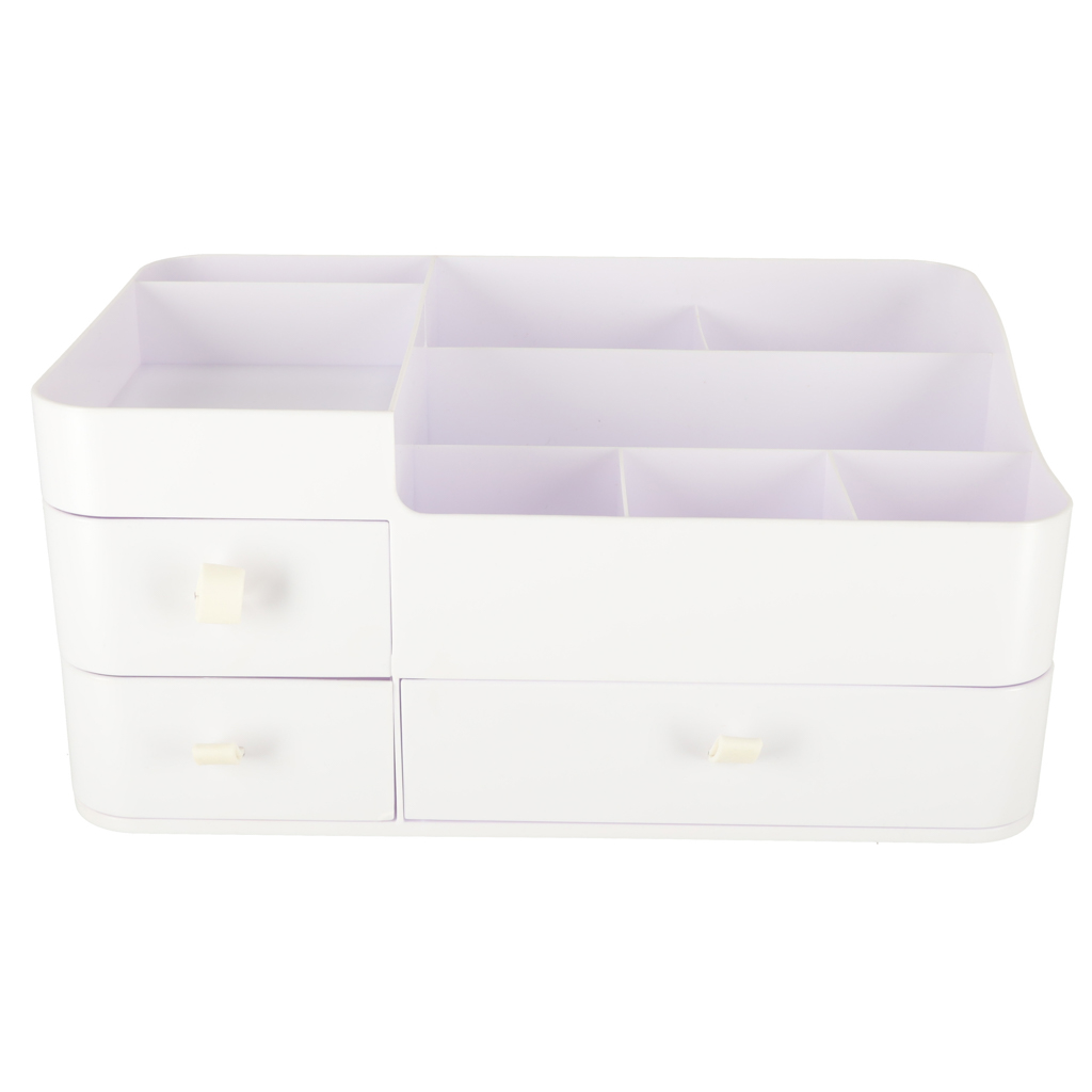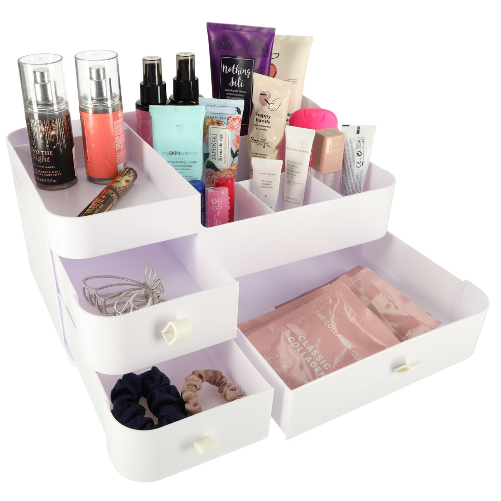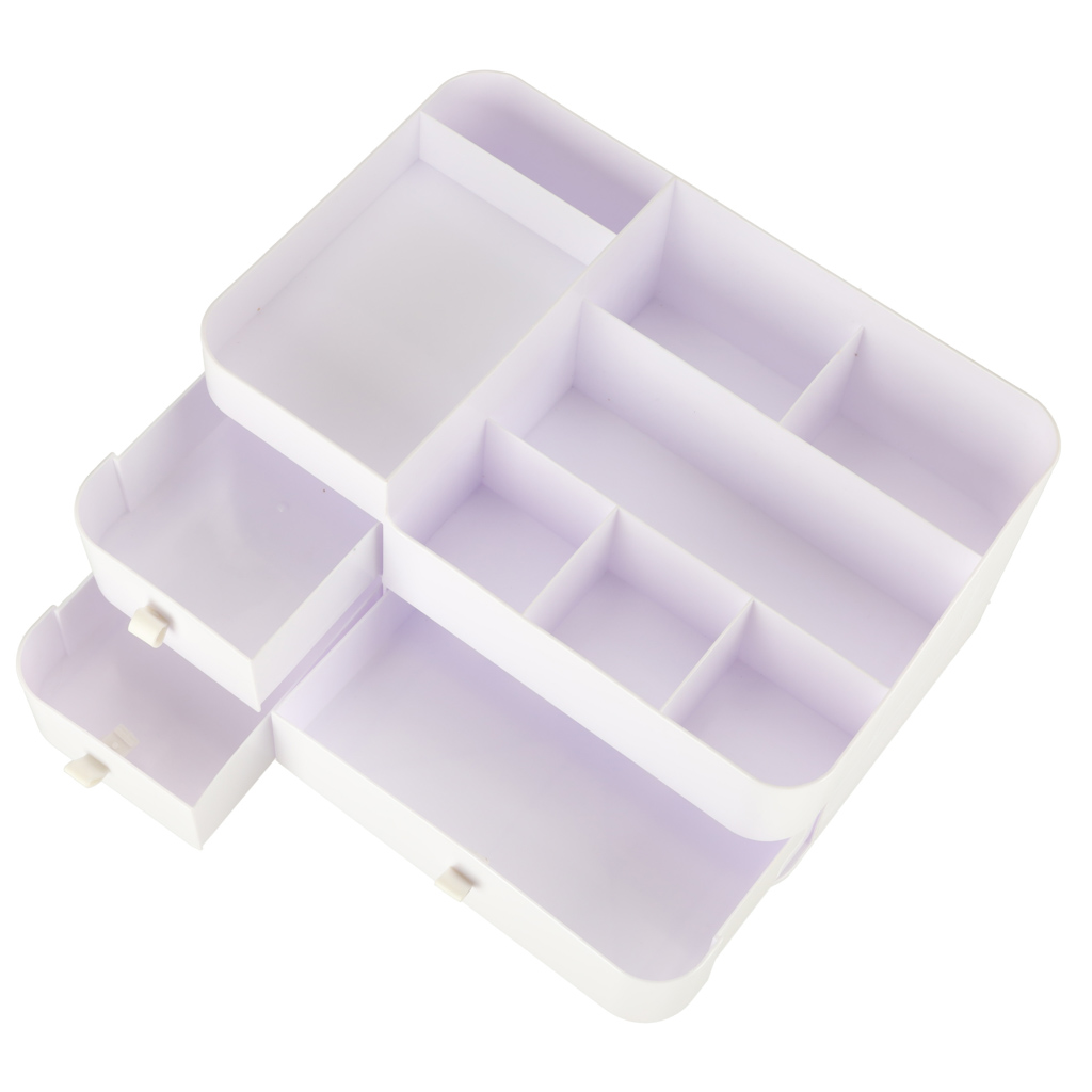 Organizer wyposażony jest w trzy szuflady, które gładko się wysuwają. Zapewnia to łatwy dostęp do zawartości, a jednocześnie pozwala utrzymać wszystko w jednym miejscu. Na górnej części znajdują się siedem przegródek o różnych rozmiarach, idealnych do segregowania kosmetyków codziennego użytku, takich jak pędzle, szminki czy tusze do rzęs.