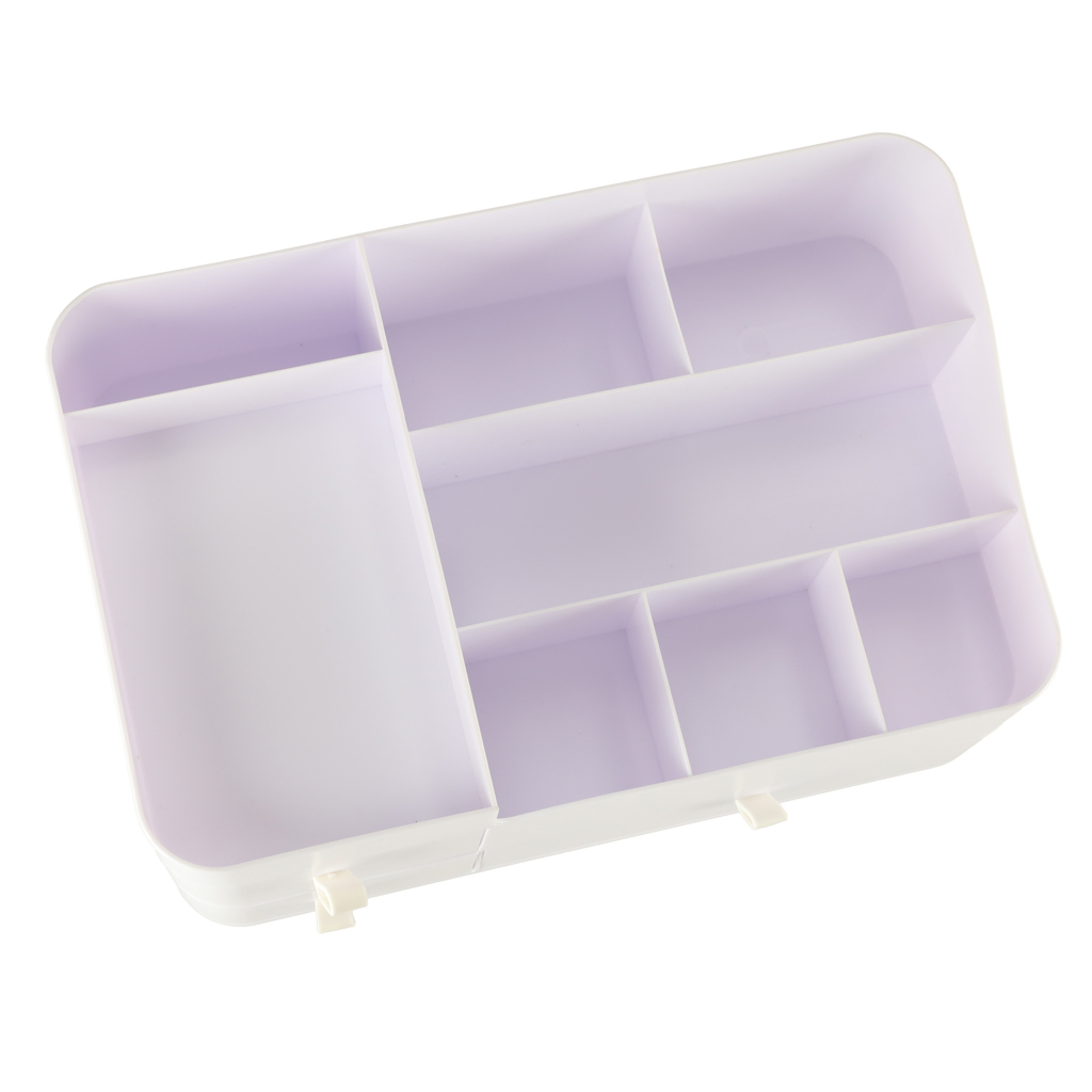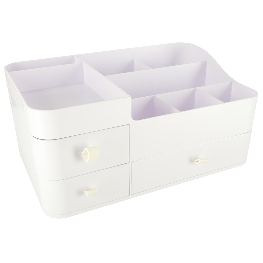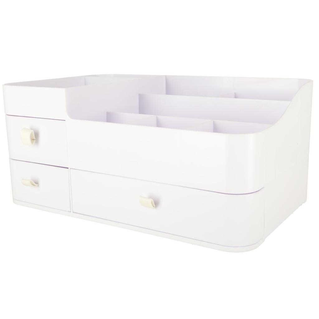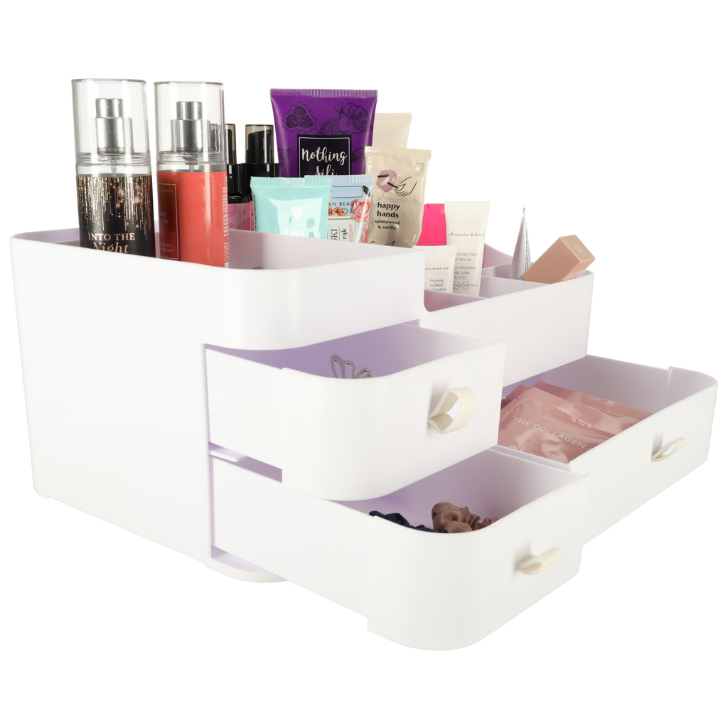 Organizer wyposażony jest w trzy szuflady, które gładko się wysuwają. Zapewnia to łatwy dostęp do zawartości, a jednocześnie pozwala utrzymać wszystko w jednym miejscu. Na górnej części znajdują się siedem przegródek o różnych rozmiarach, idealnych do segregowania kosmetyków codziennego użytku, takich jak pędzle, szminki czy tusze do rzęs.