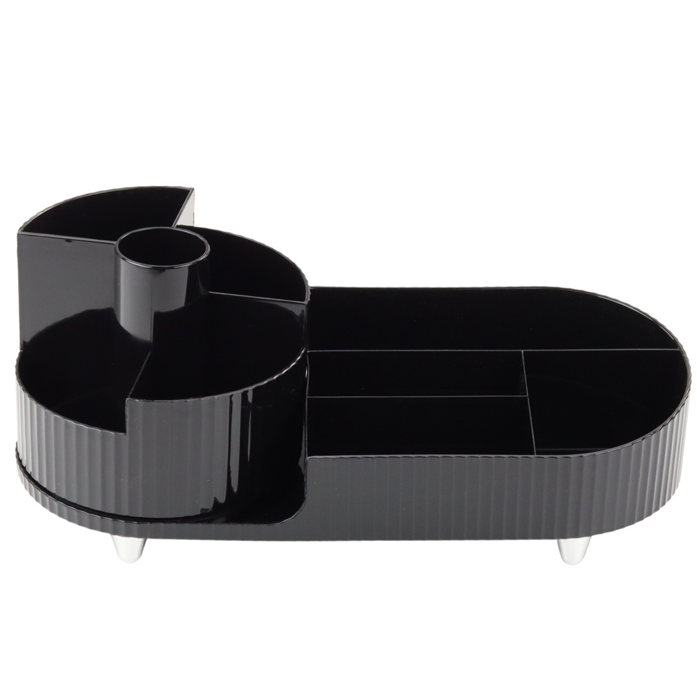 Elegancki, obrotowy organizer w kolorze czarnym to uniwersalne i funkcjonalne rozwiązanie, które doskonale sprawdzi się zarówno w łazience, jak i na biurku. Dzięki przemyślanej konstrukcji i praktycznym przegrodom, produkt ten umożliwia wygodne przechowywanie. Może być także praktycznym rozwiązaniem na biurko do przechowywania przyborów szkolnych i biurowych.
