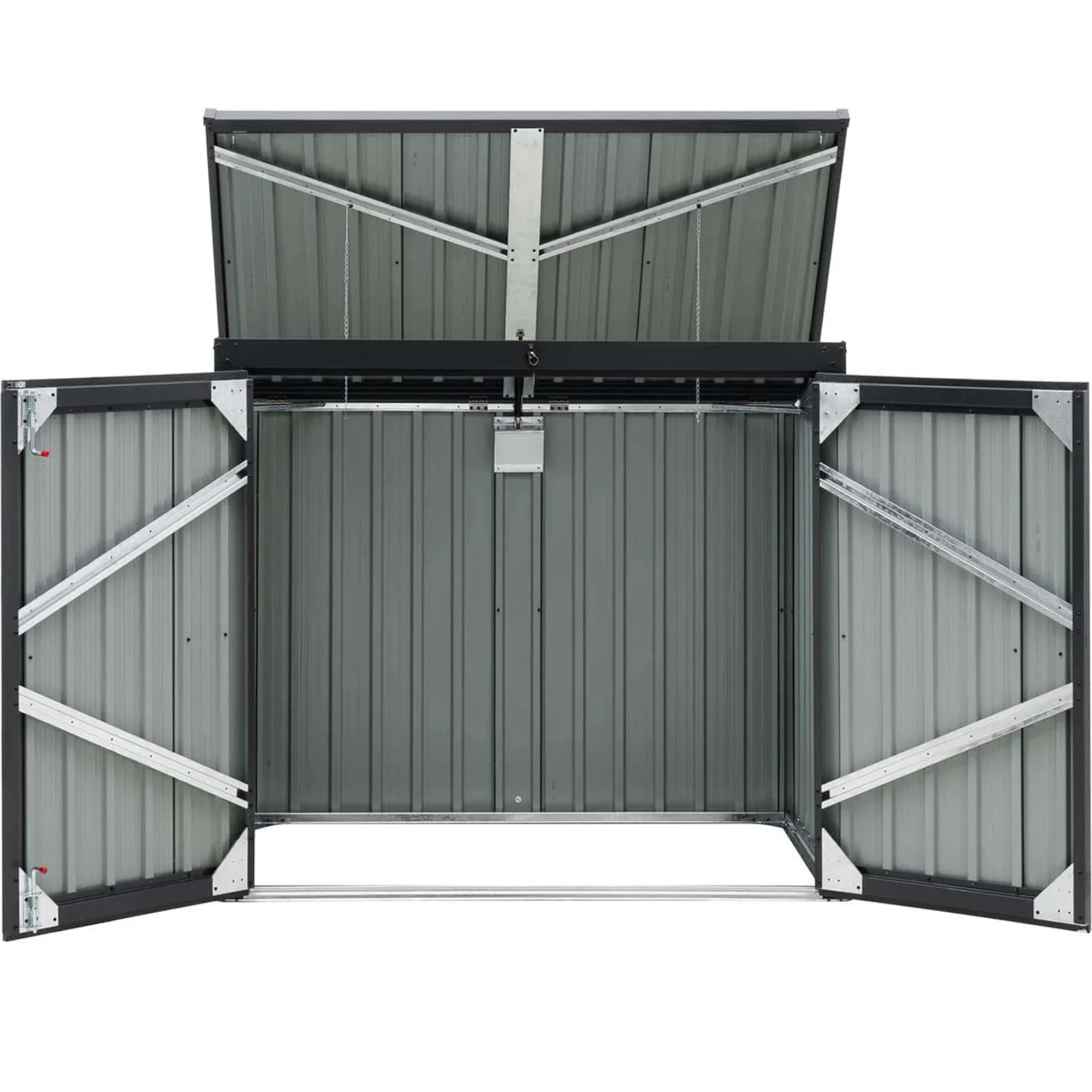 Osłona obudowa na 2 kosze kubły na śmieci 240 l metalowa to doskonałe rozwiązanie do estetycznego i bezpiecznego przechowywania odpadków. Dzięki wymiarom 155 x 90 x 133 cm, pomieści dwa kontenery o pojemności 240 litrów.