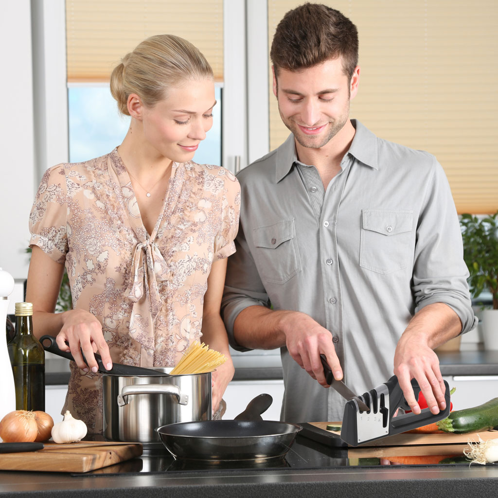 Ostrzałka posiada 3 gniazda ostrzące oraz dodatkowy otwór do nożyczek. Dzięki temu szybko przywrócisz ostrość swoim nożom i nożyczkom, osiągając efekty jak w profesjonalnej kuchni.