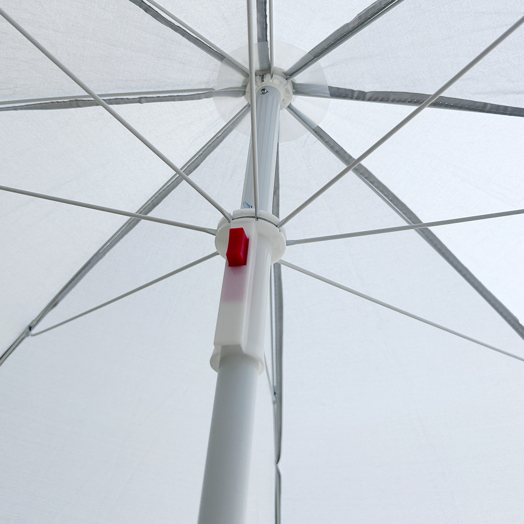 Materiał parasola wzbogacony jest o srebrną warstwę, która odbija szkodliwe promienie UV. To pozwala cieszyć się przyjemnym cieniem przez wiele godzin. Regulowana wysokość (140-180 cm) umożliwia dostosowanie parasola do pozycji słońca, co zwiększa komfort użytkowania.