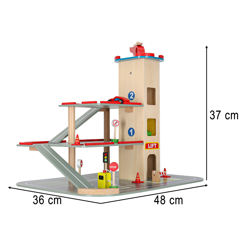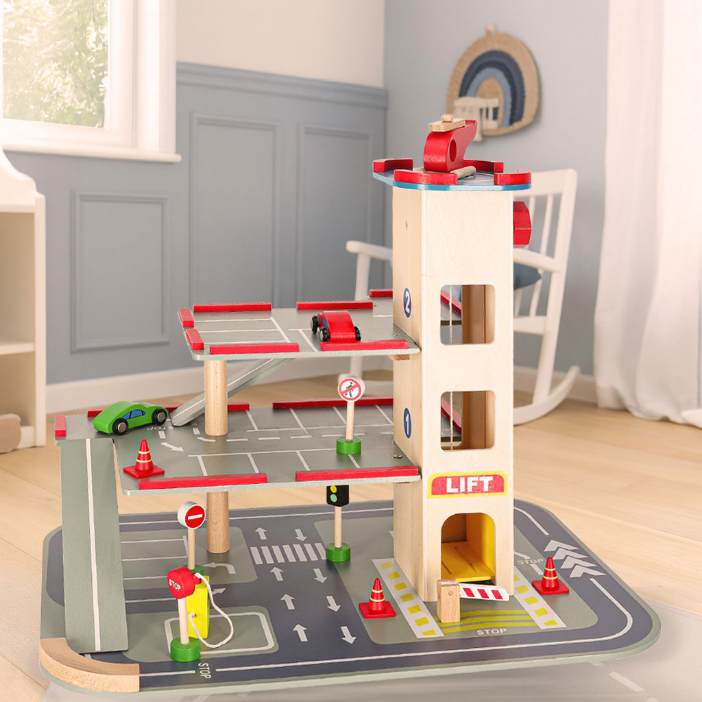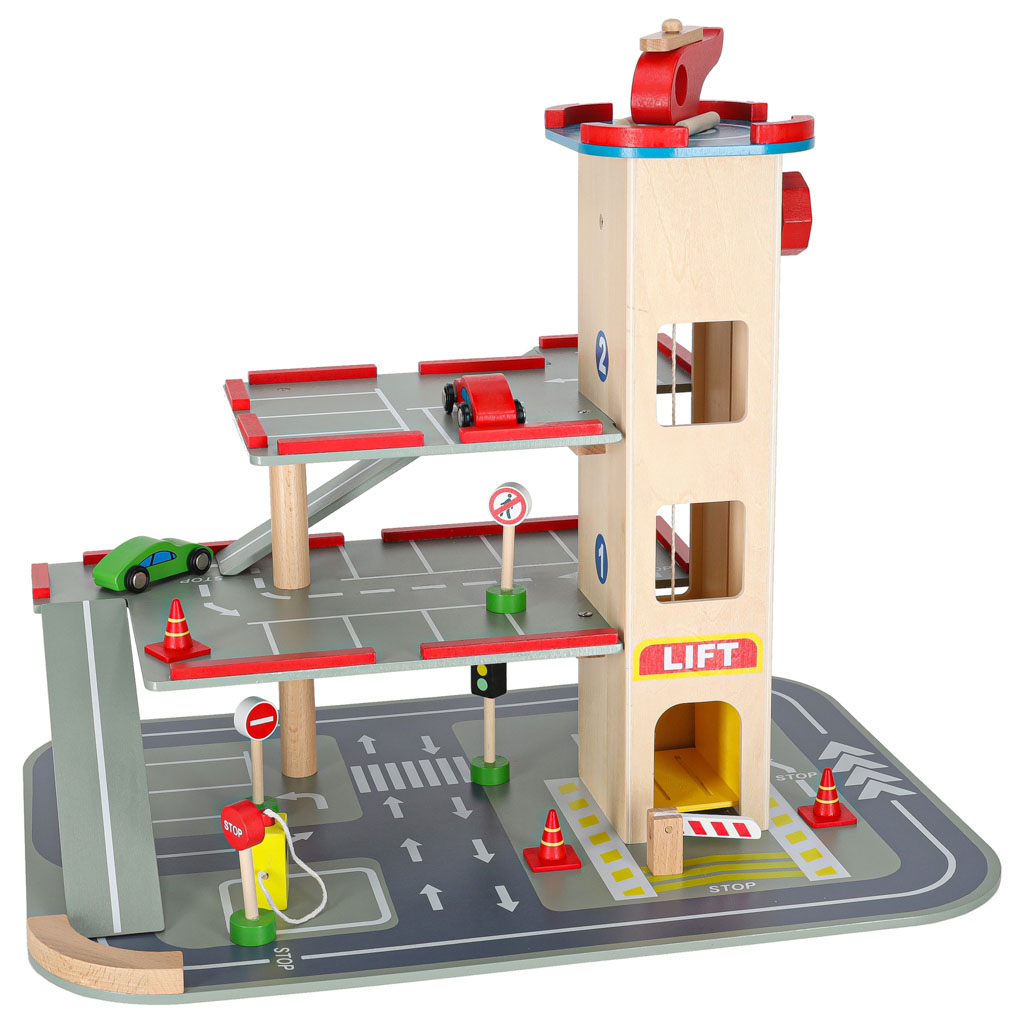 Oferujemy fantastyczny drewniany parking, który zapewni Twojemu dziecku wiele godzin wspaniałej zabawy. To piętrowy garaż z aż czterema poziomami, idealny do parkowania drewnianych samochodzików oraz innych pojazdów. Dzięki windzie, dzieci mogą łatwo przemieszczać swoje autka między piętrami.