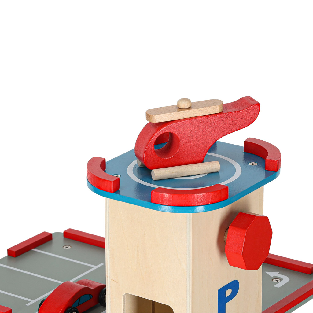 Na szczycie parkingu znajduje się lądowisko dla helikoptera, który również jest częścią zestawu. Dodatkowe akcesoria, takie jak dystrybutor paliwa i znaki drogowe, umożliwiają kreatywną zabawę oraz naukę zasad ruchu drogowego.