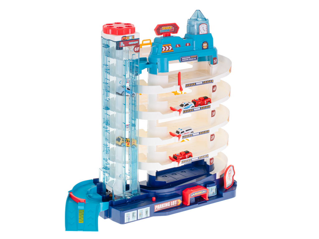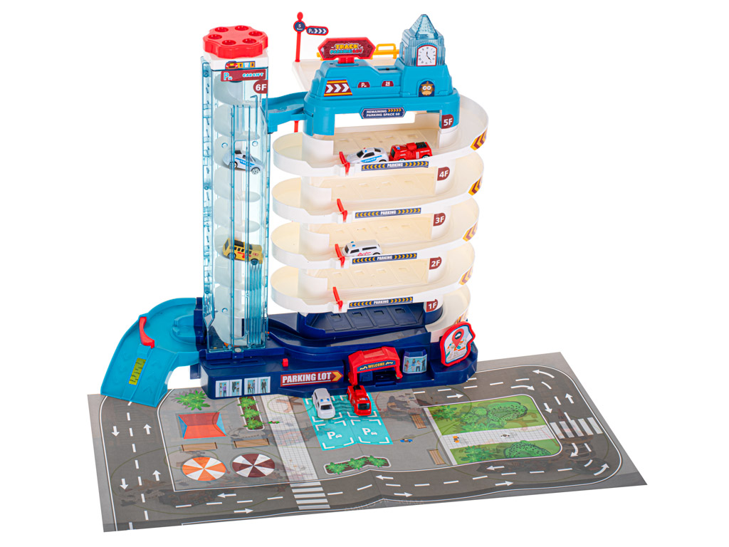 Parking ma 5 poziomów, które pomieszczą aż 8 samochodzików dołączonych do zestawu. Auta mogą wjeżdżać na górę za pomocą automatycznej windy, co sprawia, że zabawa staje się jeszcze bardziej ekscytująca. Winda jest wyposażona w efektowne, kolorowe światła, które mrugają podczas wjazdu, dodając atrakcyjności zabawie.