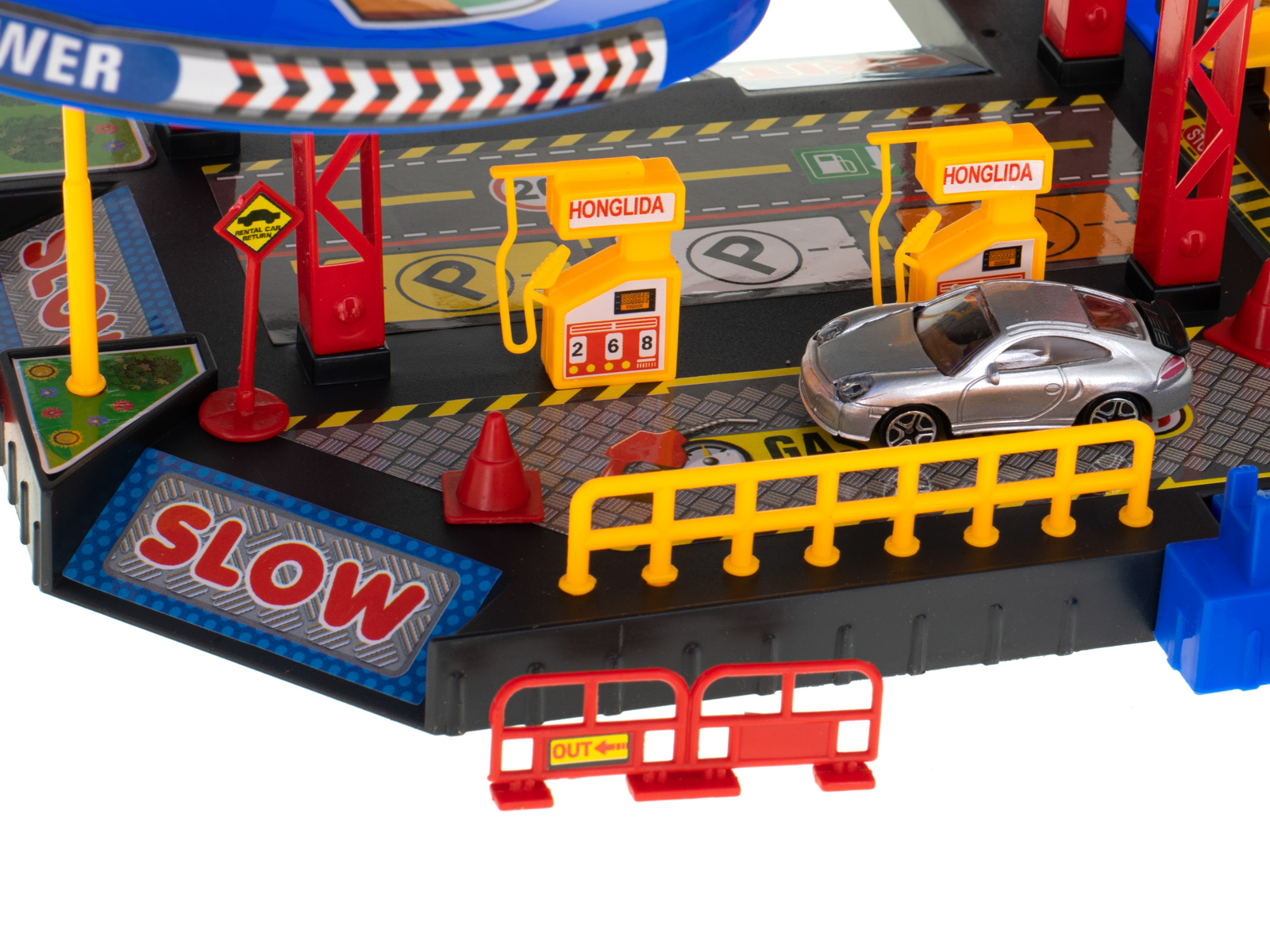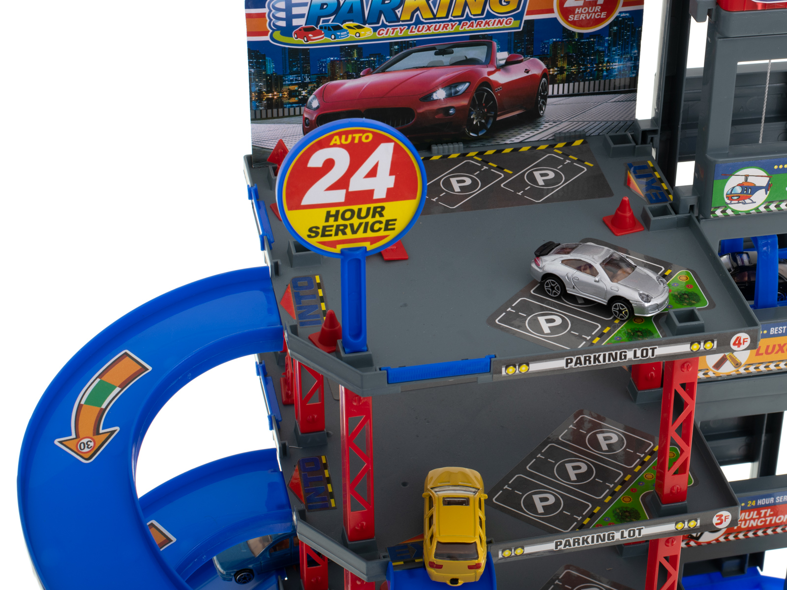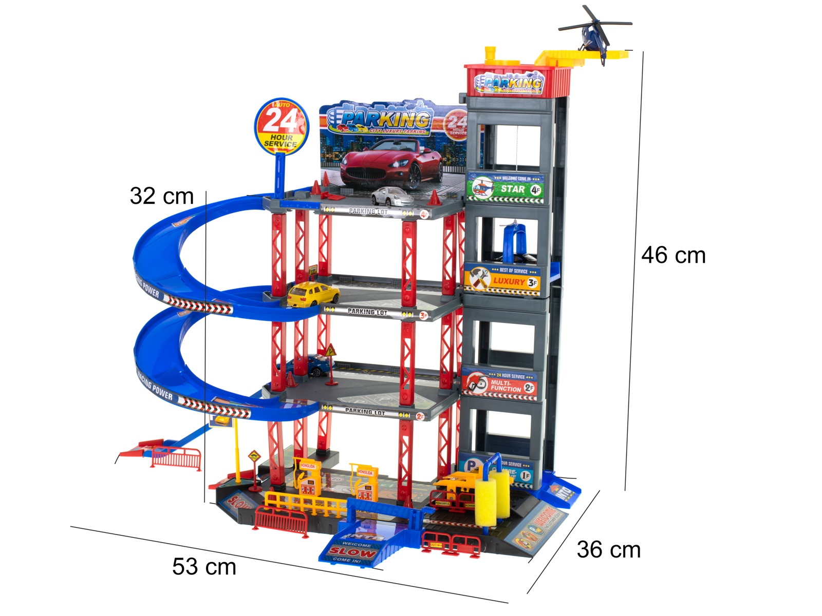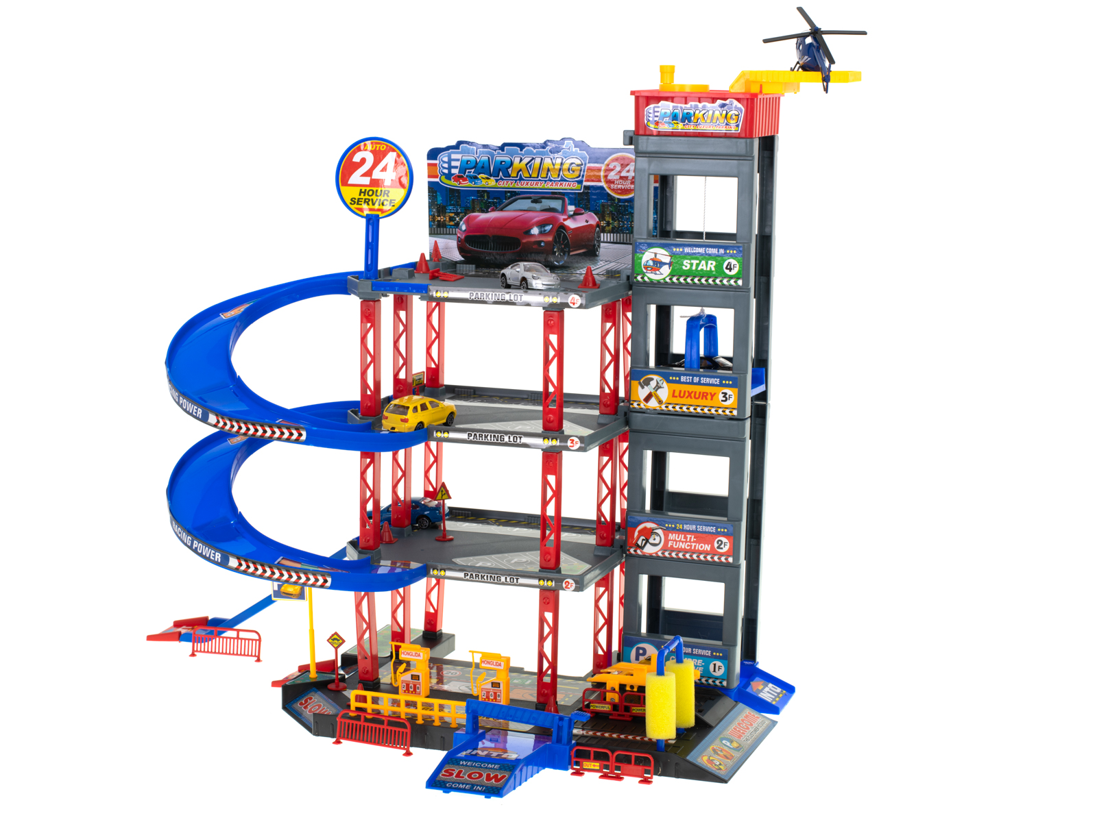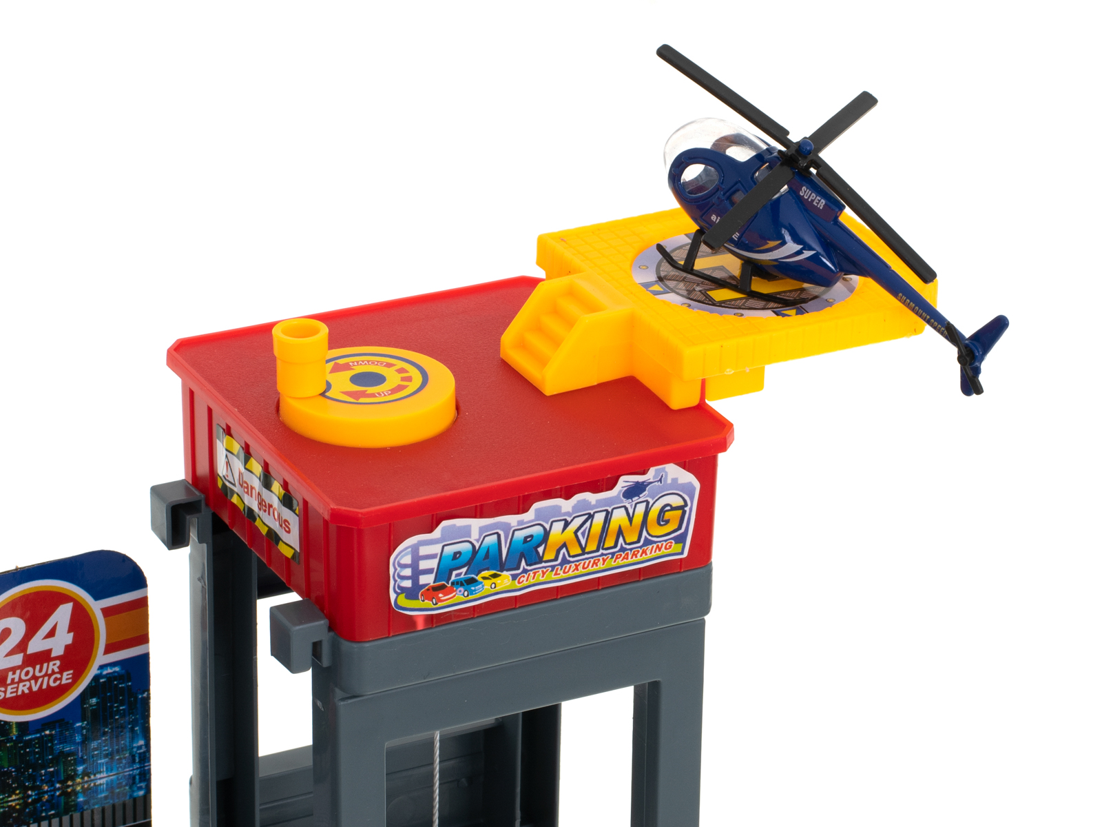 Każde piętro pomieści 6 aut, co pozwoli uporządkować zabawki Twojego dziecka. Wjazd na parking odbywa się przez unoszony szlaban, a do kolejnych poziomów prowadzi winda. Zobacz, jak szybko samochodzik pokonuje trasę na dół!