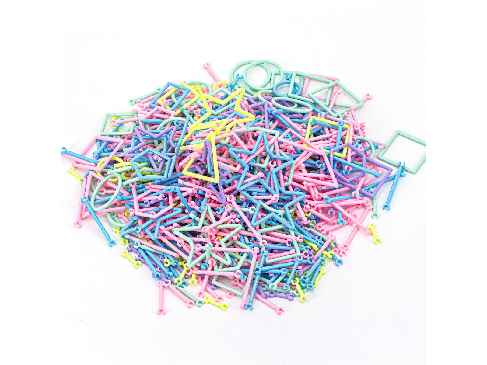 Klocki łączymy ze sobą za pomocą kleszczy znajdujących się na końcach każdego prostego patyczka. Dodatkowo w zestawie znajduje się mnóstwo łączników o różnych kształtach i kolorach, jak np. gwiazdki, kwadraty, koła.