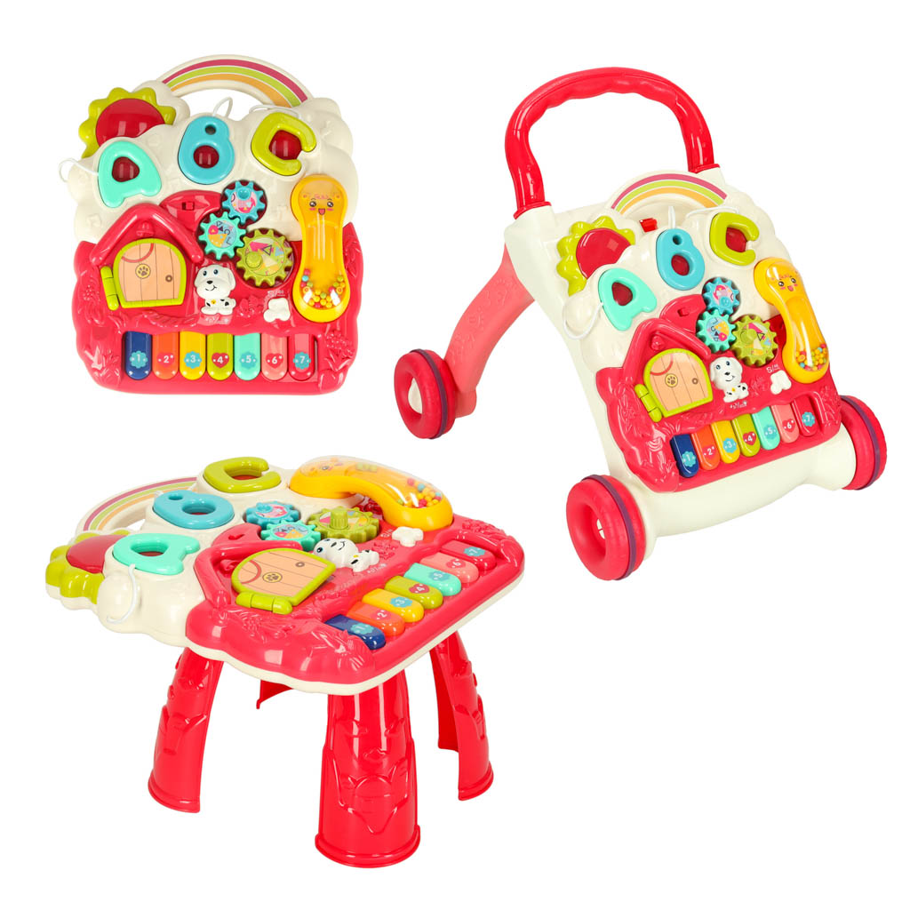 Różowy stolik interaktywny to wyjątkowy produkt, który łączy w sobie cztery funkcje: zabawkę do łóżeczka, tablicę manipulacyjną, stolik edukacyjny oraz praktyczny chodzik. Dzięki możliwości wymiany elementów, łatwo przekształcisz go w ulubioną zabawkę Twojego dziecka.