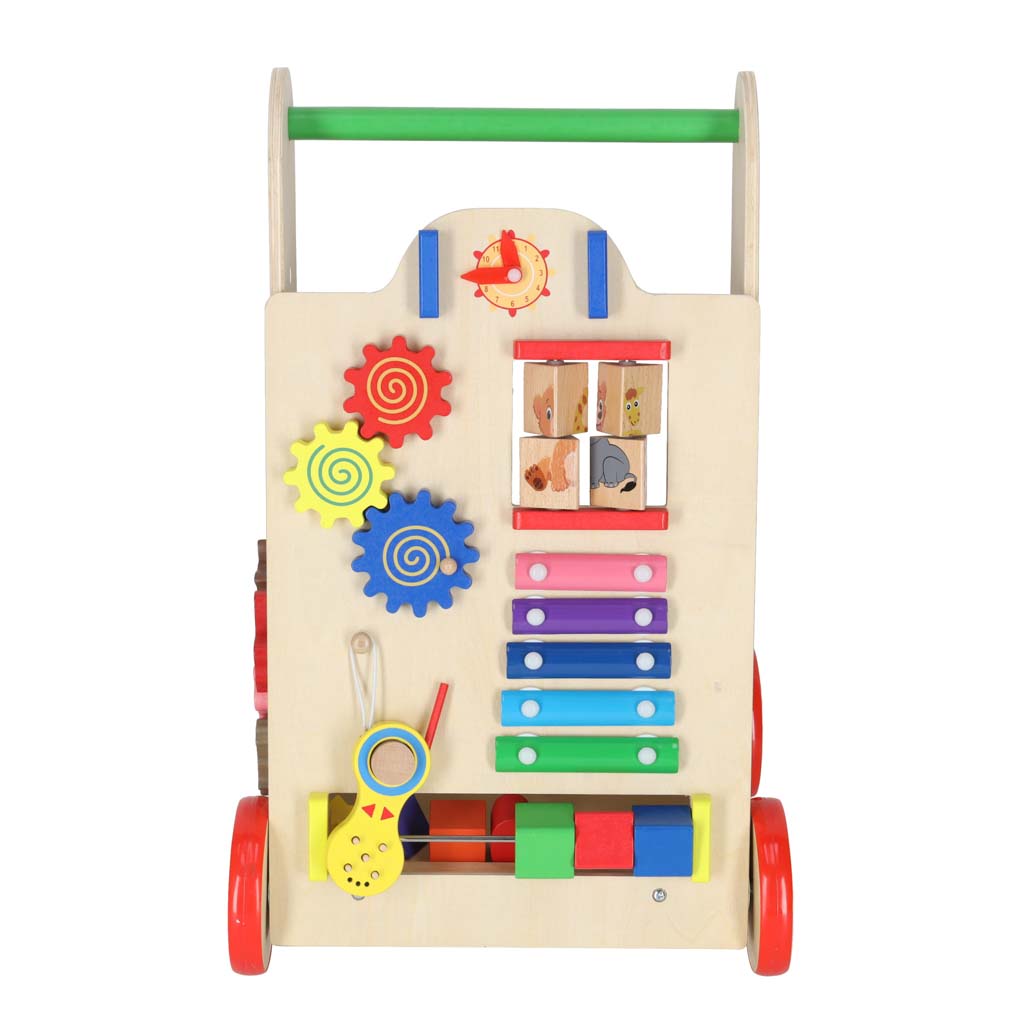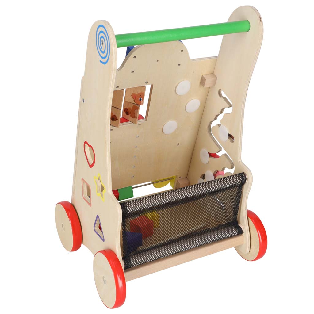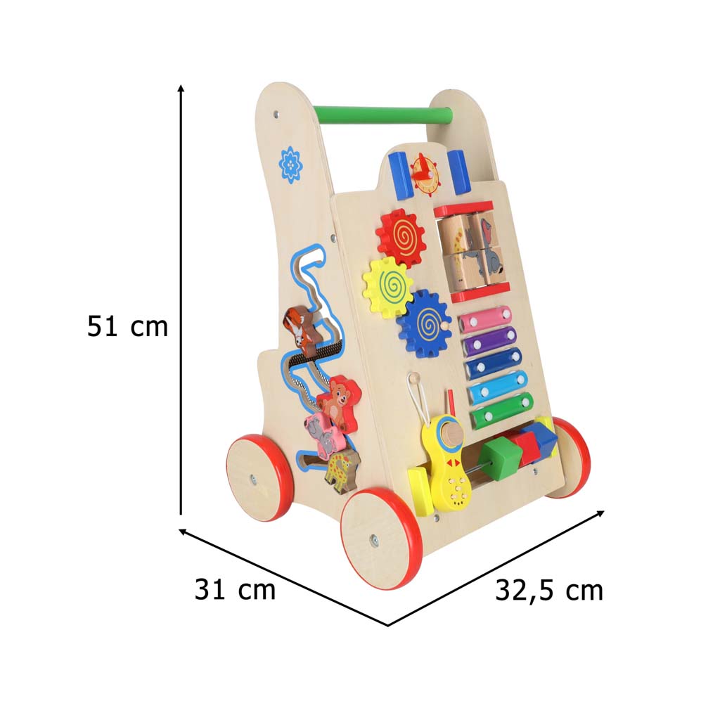 Rodzice, którzy stawiają na ekologiczne akcesoria, z pewnością docenią drewnianą konstrukcję tego pchacza. Zabawka dostarcza rozrywki na wiele sposobów. Z przodu pchacza znajduje się tablica manipulacyjna z różnorodnymi elementami, które zachwycą dzieci:
