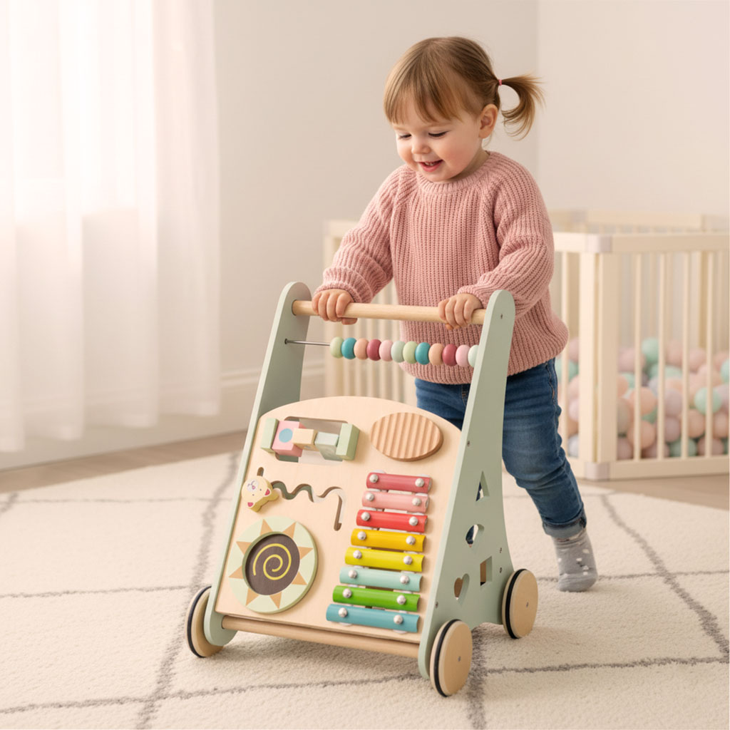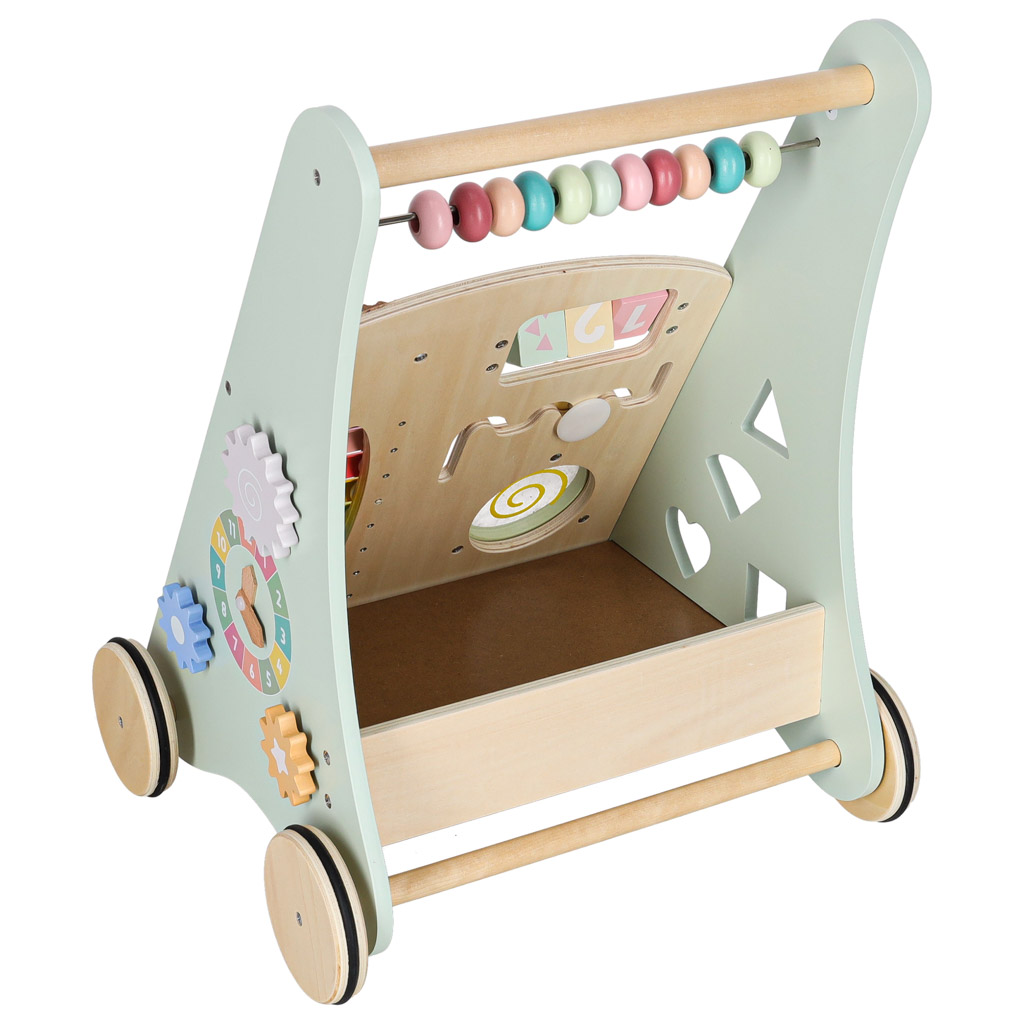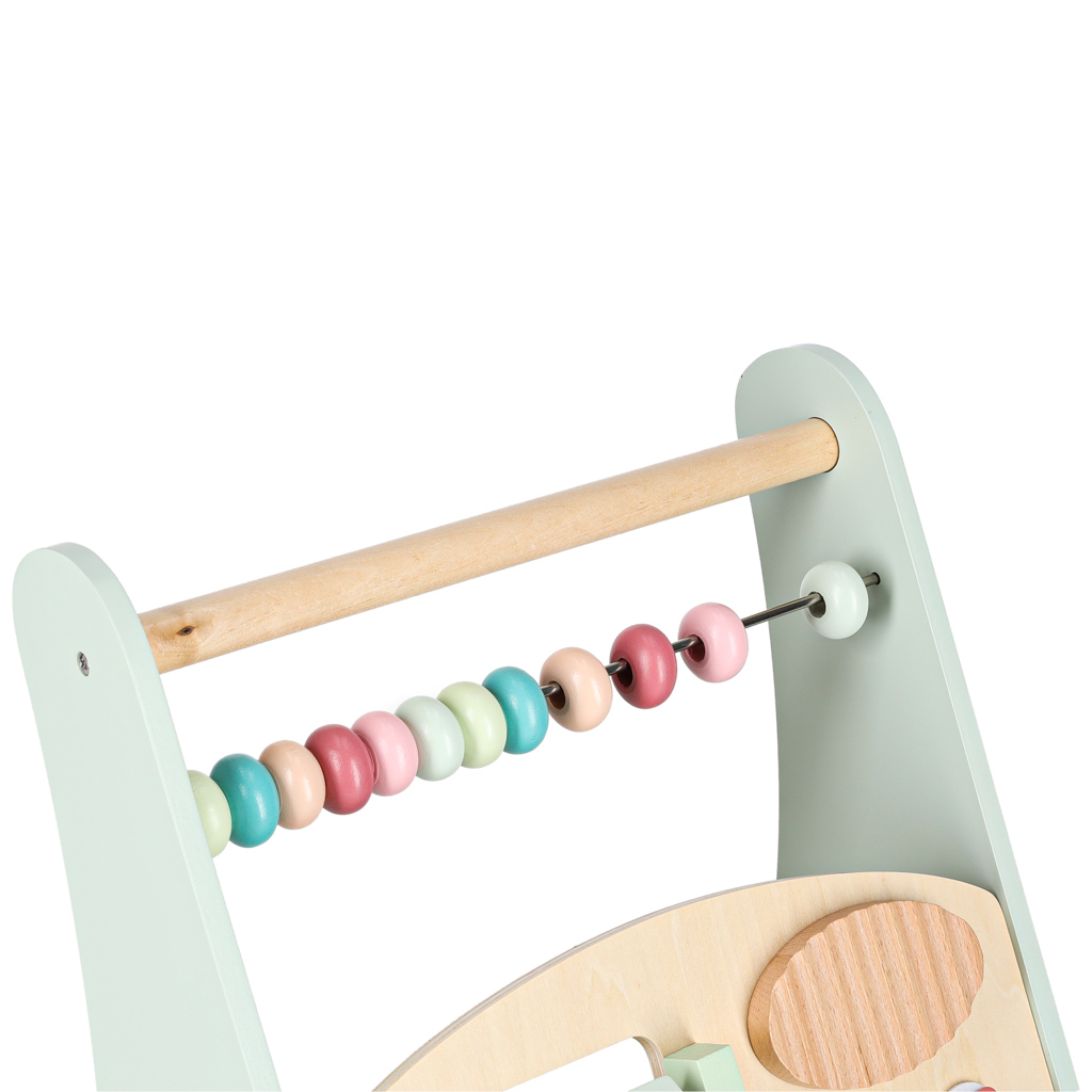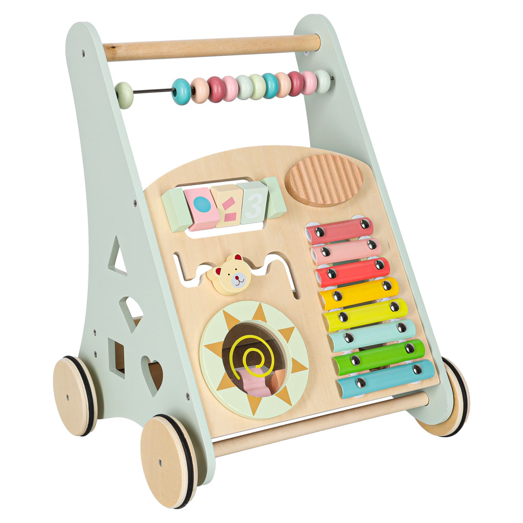 To drewniany chodzik edukacyjny - wielofunkcyjna zabawka wspomagająca naukę chodzenia oraz rozwój sensoryczny i manualny dziecka. Wykonany z naturalnego drewna, pomalowany bezpiecznymi farbami wodnymi w pastelowych kolorach. Łączy funkcje pchacza i centrum aktywności.