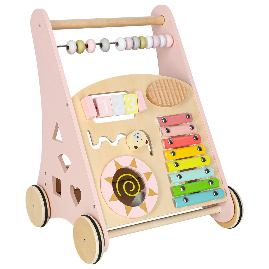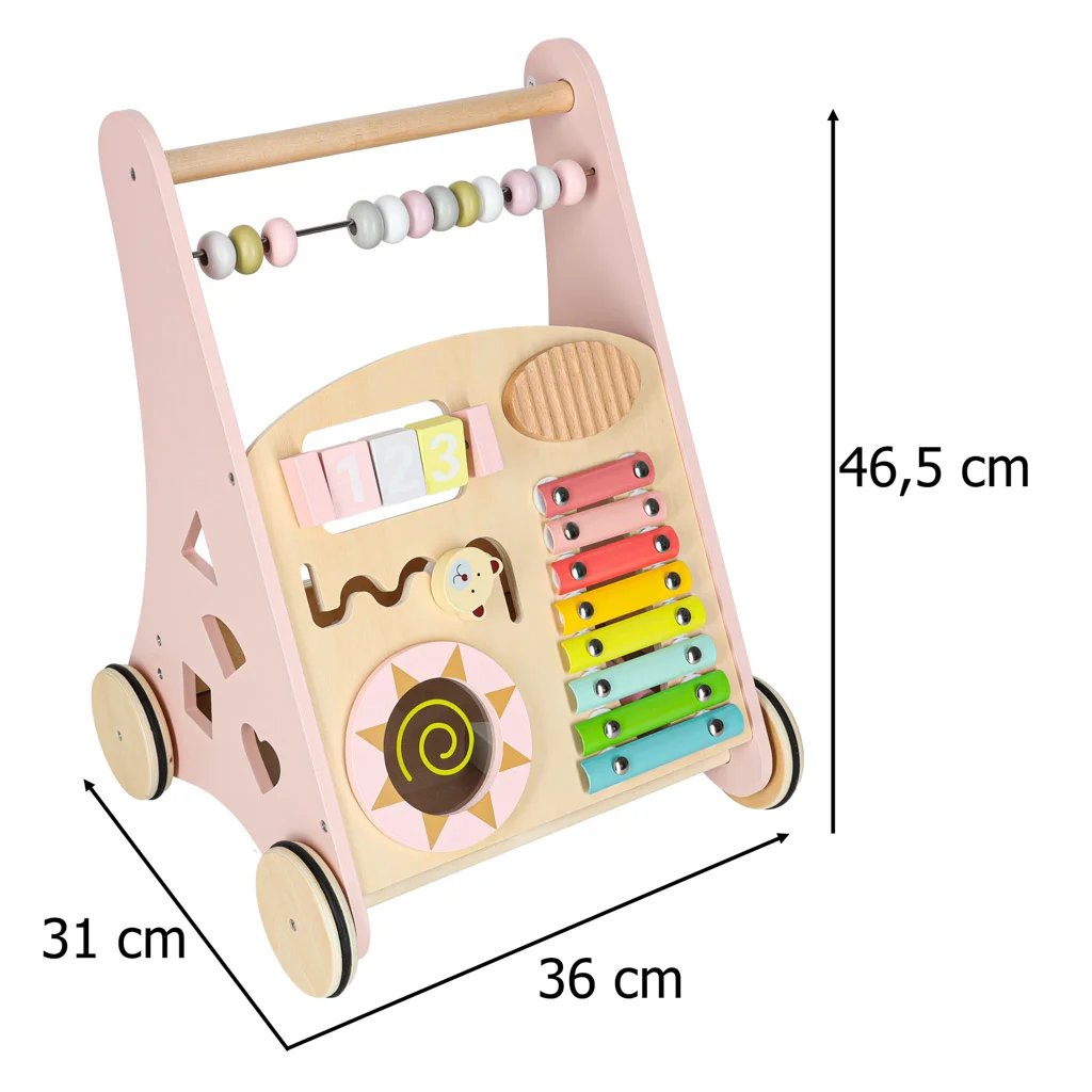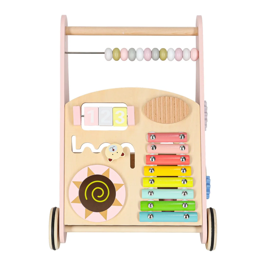 Oferujemy wyjątkowy drewniany chodzik edukacyjny, który jest nie tylko pchaczem, ale także centrum aktywności dla Twojego dziecka. Zapewnia on wsparcie w nauce chodzenia oraz rozwój sensoryczny i manualny, co czyni go doskonałą zabawką dla maluchów.