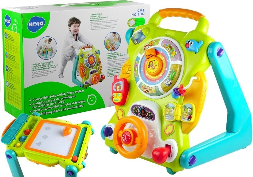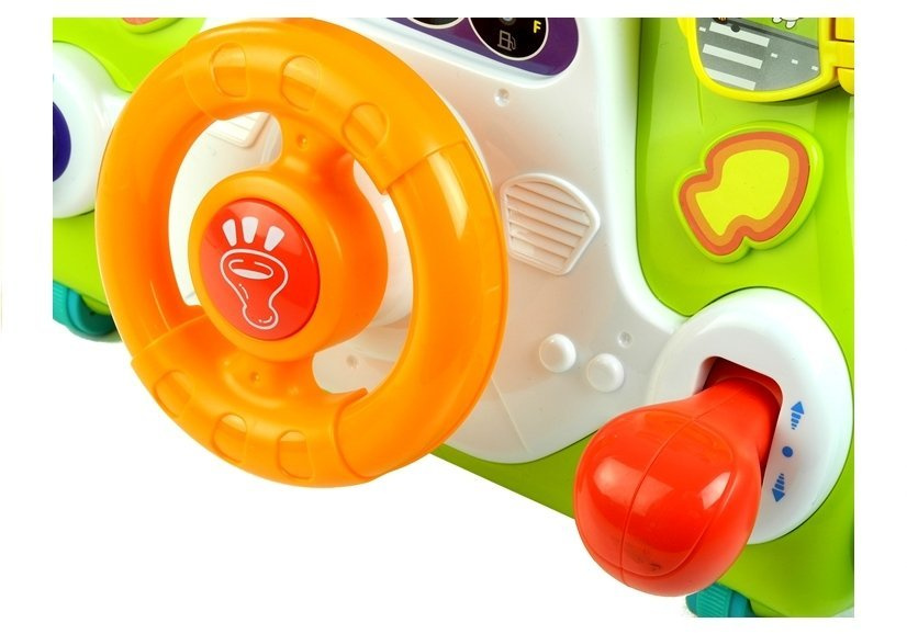 Edukacyjna zabawka zainteresuje każdemu malucha odgłosami aut, wesołego śmiechu dzieci, a także kolorowymi światełkami. Co ciekawe, jest bardzo uniwersalna i funkcjonalna, może być pchaczem dla dzieci powyżej 9. miesiąca życia, który w bezpieczny i prosty sposób pomaga siadać, wstawać i stawiać pierwsze kroki, panelem edukacyjnym dla dzieci powyżej 1. roku życia, który usprawni koordynację dziecka, a także rozwinie jego umiejętności motoryczne, a także stolikiem do rysowania i pisania dla dzieci, które osiągnęły 1,5 roku życia — wystarczy zmienić konstrukcję pchacza, w efekcie czego powstanie świetny stolik ze znikopisem. Tuż nad nim znajduje się specjalny otwór, w którym umieszczono rysik i trzy stempelki - kółko, kwadrat i trójkąt.