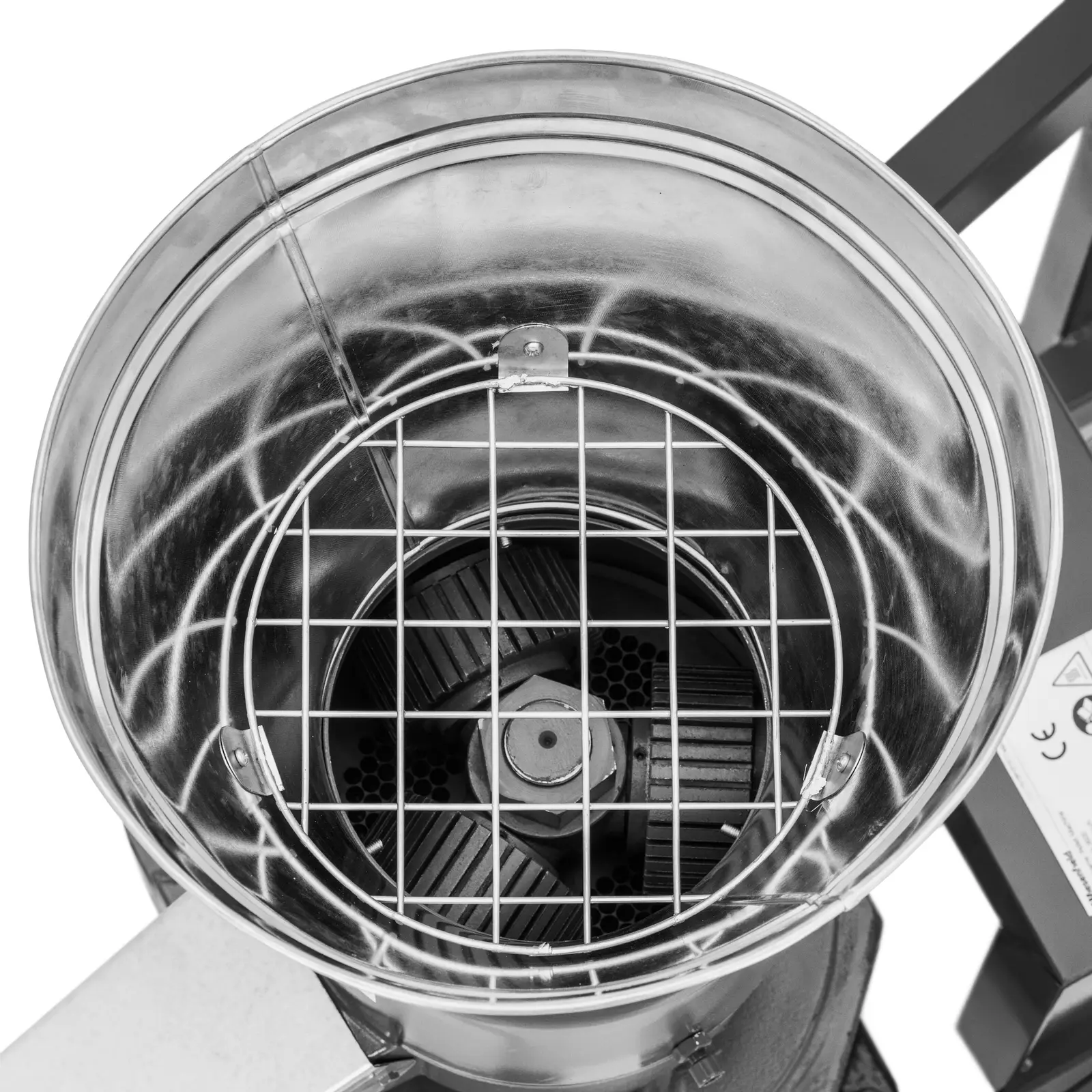 Peleciarka nagrzewa materiał do temperatury 60-80°C, co wpływa na jakość i trwałość granulatu. Dwa walce sprasowują materiał przez matrycę o średnicy 230 mm, co pozwala na uzyskanie pelletu o średnicy 6 mm. W razie potrzeby, matrycę można łatwo wymienić na inną o innej średnicy.