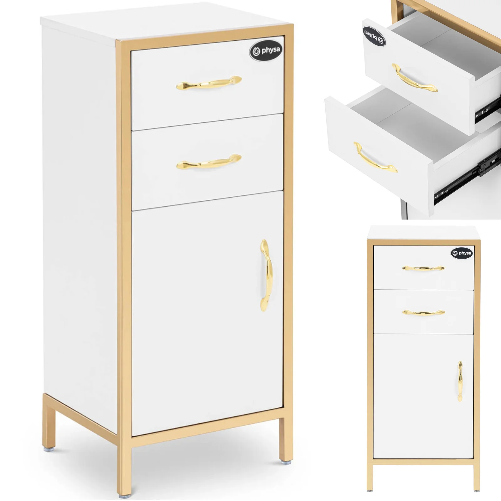 Szafka kosmetyczna fryzjerska 1 szafka 2 szuflady 30 x 35 x 80 cm - biało złota