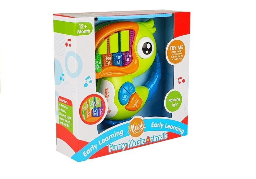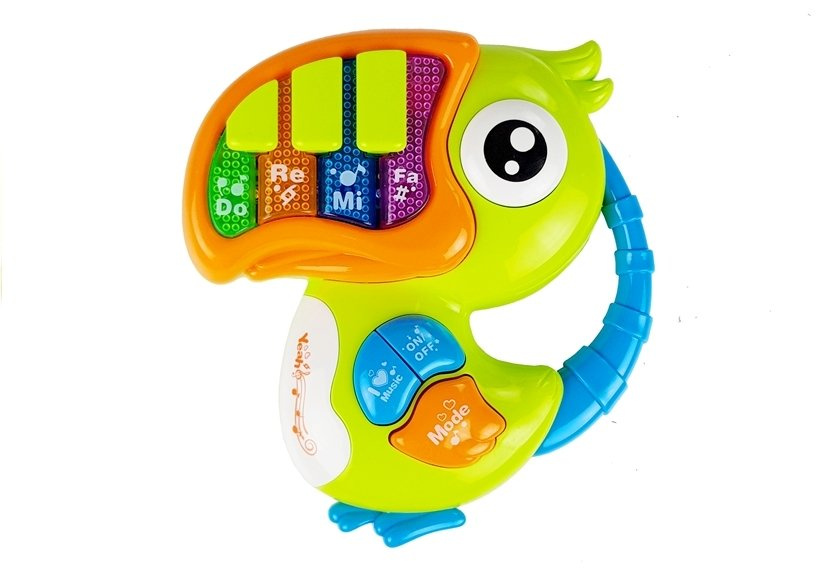 Zabawka składa się z bardzo kolorowej i wesołej konstrukcji. Pianinko w kształcie kolorowej papugi zachwyci każdego malucha.Posiada muzyczne przyciski, a zabawie towarzysza świecące światła przycisków "DO" "RE" "MI". Zabawkę uruchamiamy przyciskiem ON/OFF. Obok znajduję się przycisk "MODE", którym zmieniamy tryby dźwięków pianinka. Naciskając na klawisze możemy posłuchać wesołych melodii, odgłosów zwierząt czy standardowych dźwięków pianina odgrywając swoja własna melodię.