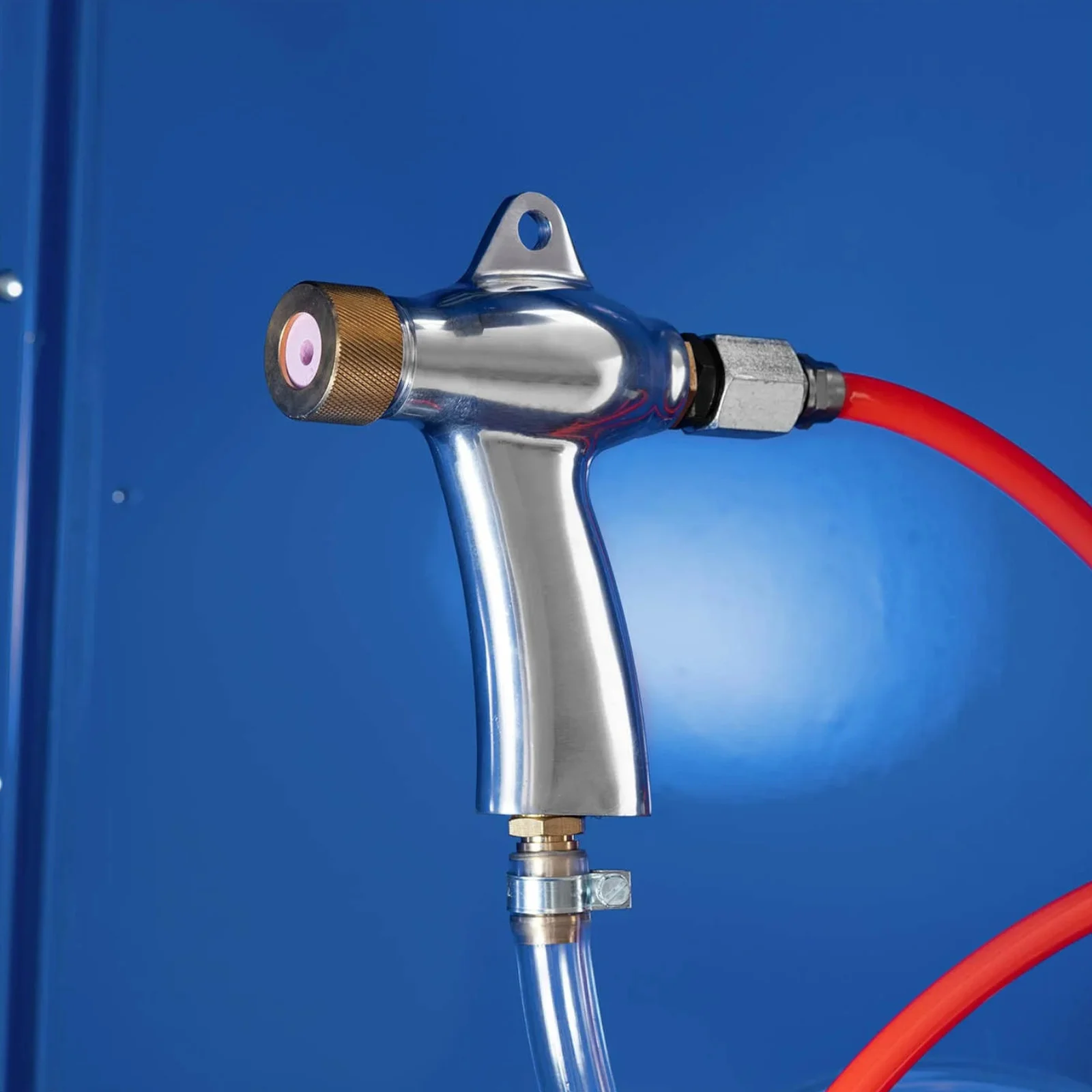 Przestronna komora robocza o wymiarach 117 x 92 x 124 cm oraz pojemności 990 l zapewnia odpowiednią przestrzeń do pracy. Umożliwia regulację ciśnienia roboczego do 125 psi (8,6 bara) oraz przepływ powietrza na poziomie 680 l/min, co zapewnia wydajność przy użyciu różnych materiałów. Dodatkowo, pedał nożny ułatwia kontrolę nad przepływem powietrza.